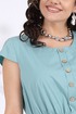 Платье женское, прямого силуэта с рукавами «крылышко». По центру лифа, имитация планки, декорирована 5 пуговицами. По лини бёдер притачной волан со сборкой. Платье выполнено из костюмно-плательной ткани на х/б подкладке. Модель отрезная по линии талии с притачной кулисой и широкой эластичной лентой внутри. На уровне линии бёдер, по переду платья, настрочены накладные карманы, верх кармана декорирован пуговицей. Длина платья – 120 см, длина рукава 8,5 см.