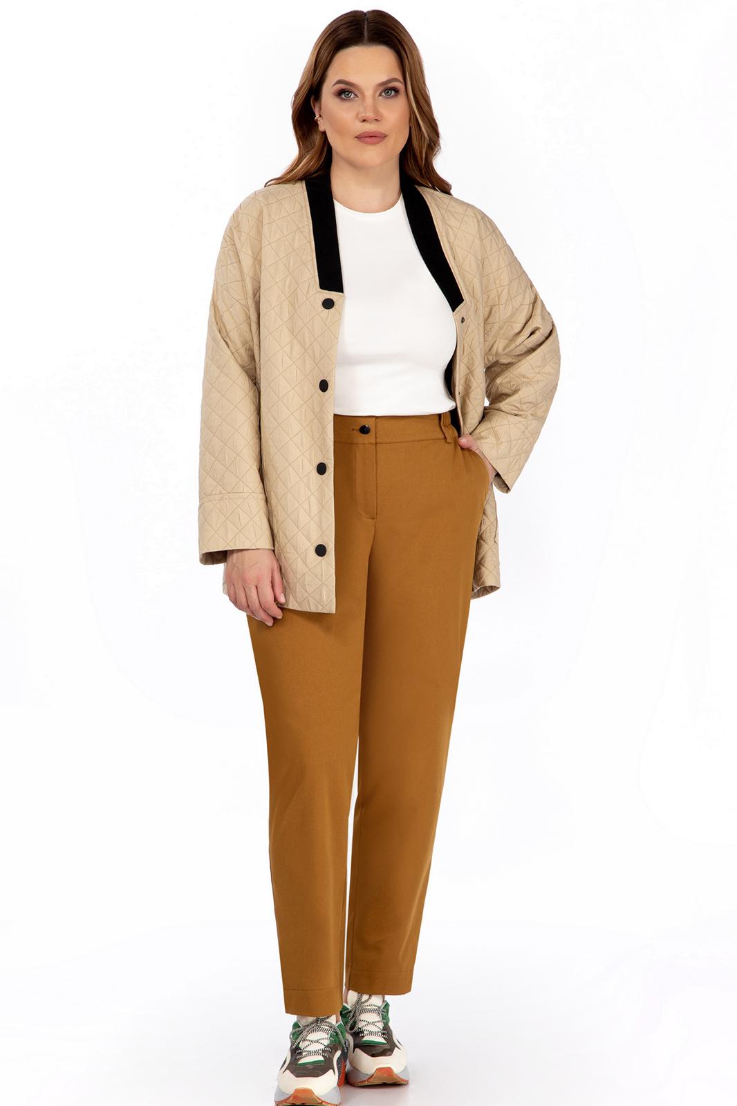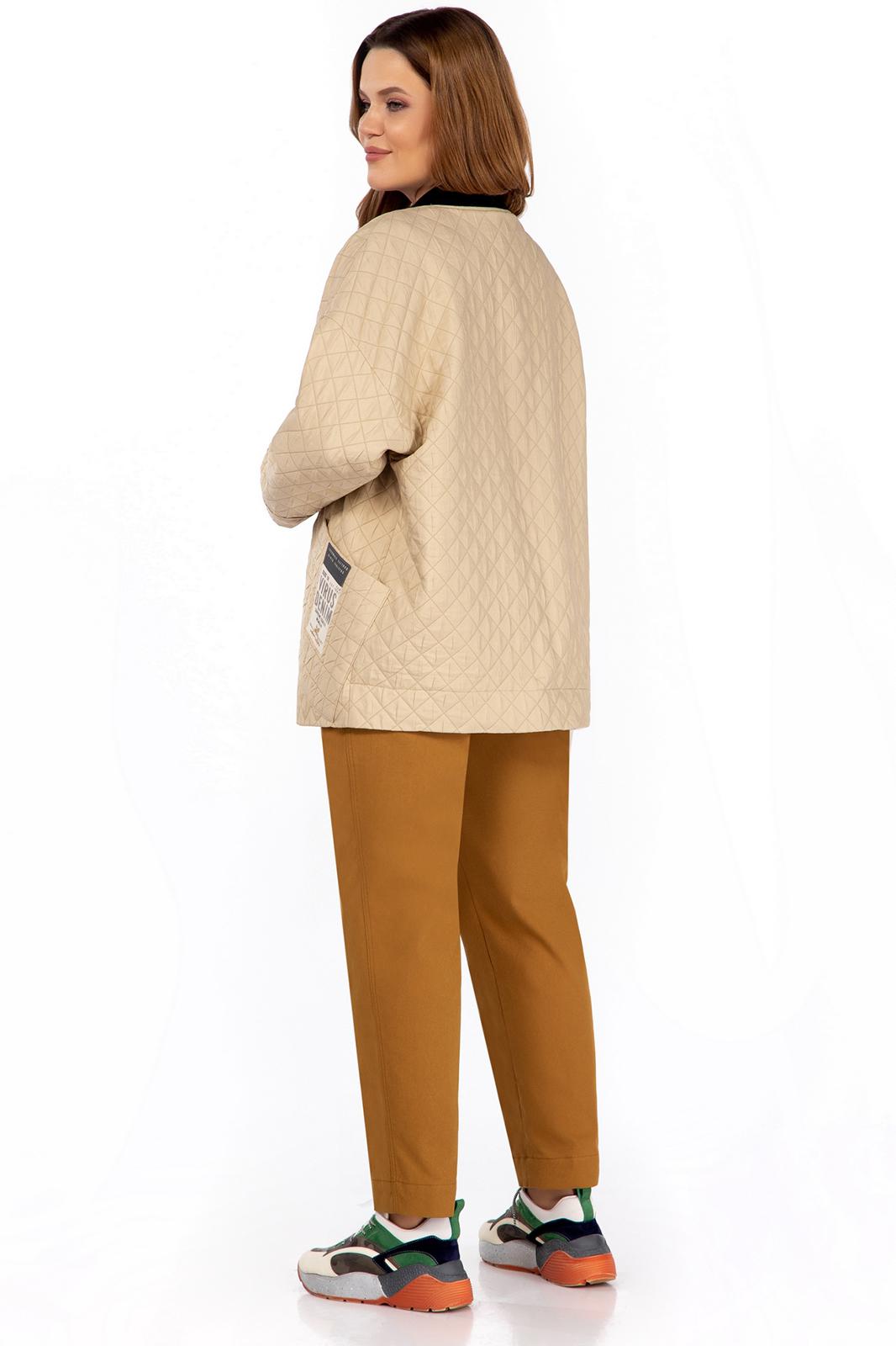 Брюки зауженные к низу, с притачным поясом, в который частично вставлена эластичная тесьма. По передним половинкам в боковых швах обработаны наклонные карманы. На задних частях брюк расположены накладные карманы. На поясе прикреплены 3 шлёвки. Длина изделия Жакет: длина спинки – 68,5 см. Брюки: длина по боковому шву – 96см.