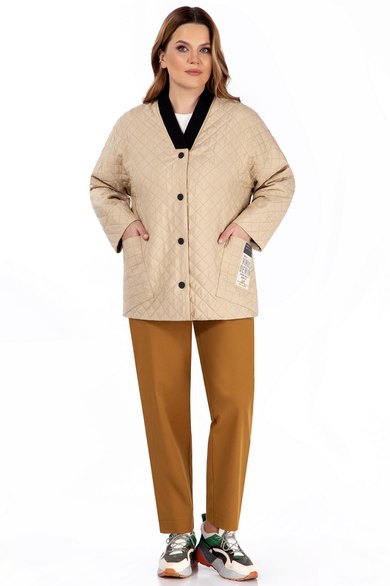 Комплект женский (бомбер и брюки). Бомбер женский, свободного силуэта, на подкладке, с втачными рукавами, с центральной сквозной застежкой на 4 кнопки. Детали переда с 2-мя наклонными накладными карманами, на одном кармане настрочена аппликация. Рукава втачные одношовные, с притачными широкими манжетами, по шву соединения обработана складка. Вырез горловины «Vобразной» формы.