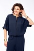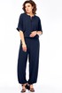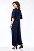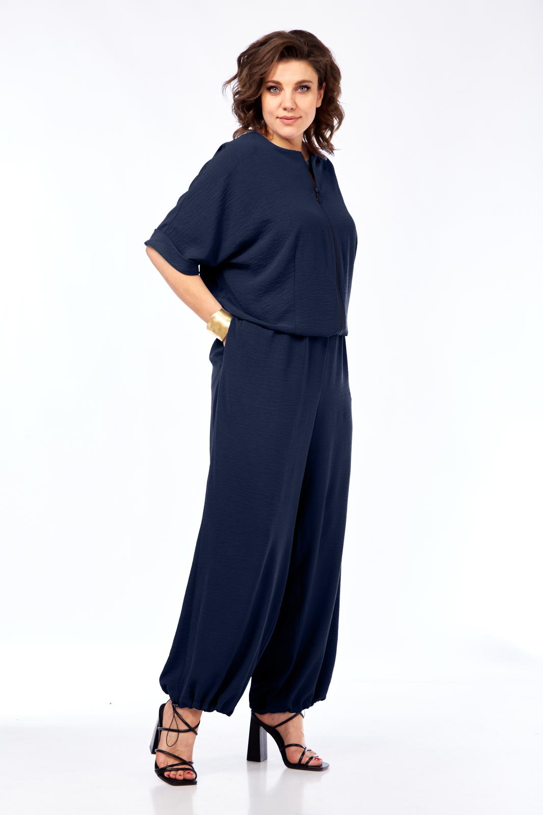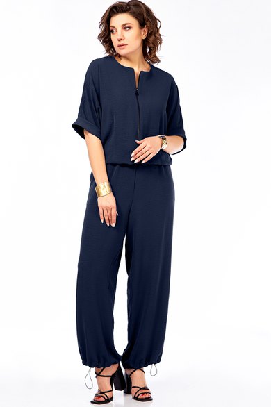 Комбинезон свободного силуэта из струящейся ткани, отрезной по линии талии и присобран на резинку. Вырез горловины округлой формы. В верхней части функциональная молния. Рукав спущенный, цельнокраеный, с притачным манжетом. По спинке средний шов. Низ брюк с фиксаторами, можно менять силуэт. В боковых швах карманы.