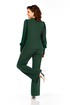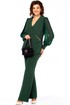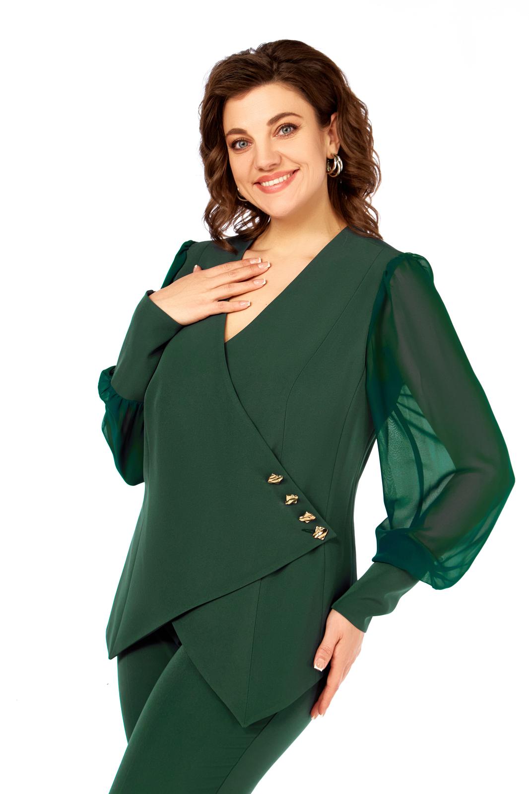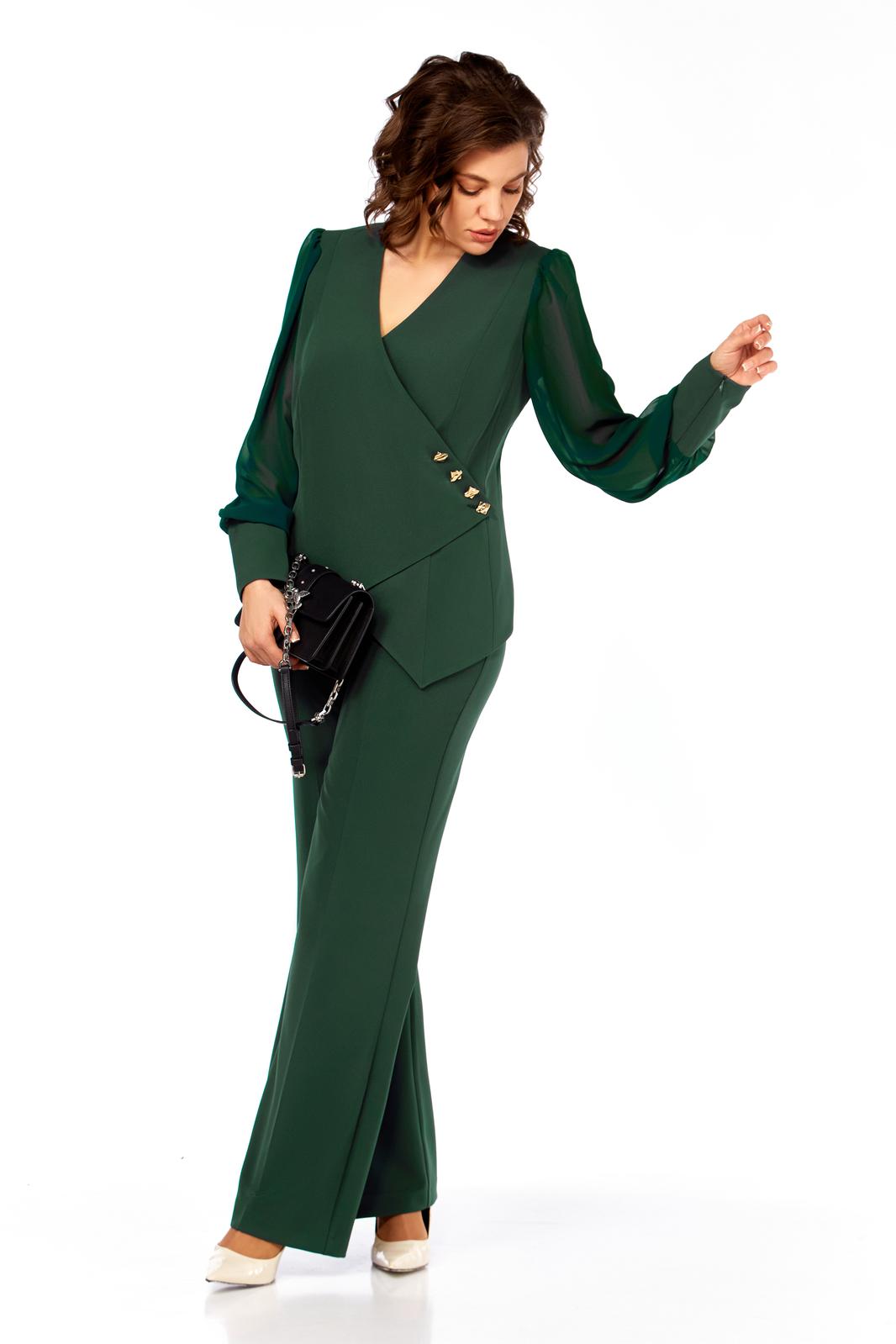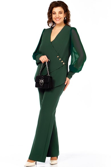 Нарядный костюм полуприлегающего силуэта. Жакет с V-образным вырезом горловины и фигурным низом, застежка на запах в облости талии, верхние пуговицы декоративные. По спинке рельефы и средний шов. Рукав втачной шифоновый на манжете из основной ткани, застегивающийся на потайную молнию. Брюки слегка расклешенные, на поясе. Пояс по спинке на резинке. Заутюжены стрелки.