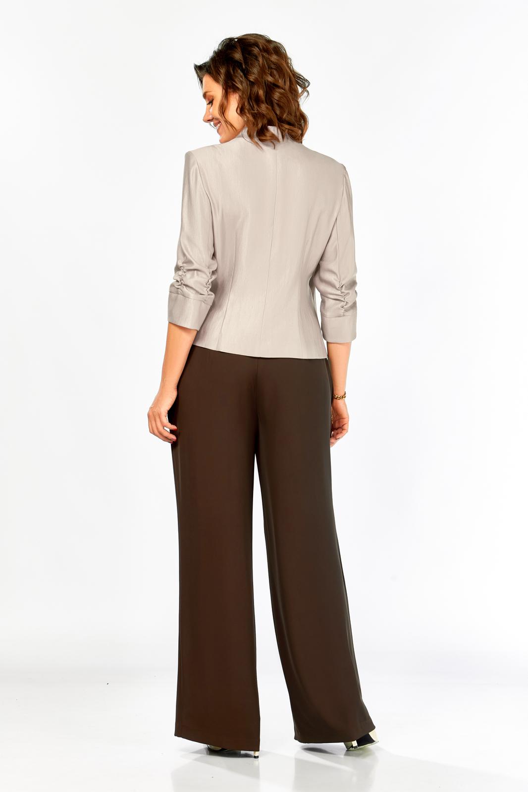 Нарядный комплект полуприлегающего силуэта. Блуза с запахом, V-образным вырезом горловины и цельнокроеной стойкой. Застежка-завязка. Спинка со средним швом и талиевыми вытачками. Рукав 3/4, присобран, по низу фигурная манжета. Брюки прямые на поясе. Пояс по спинке на резинке. Карманы в боковых швах.