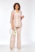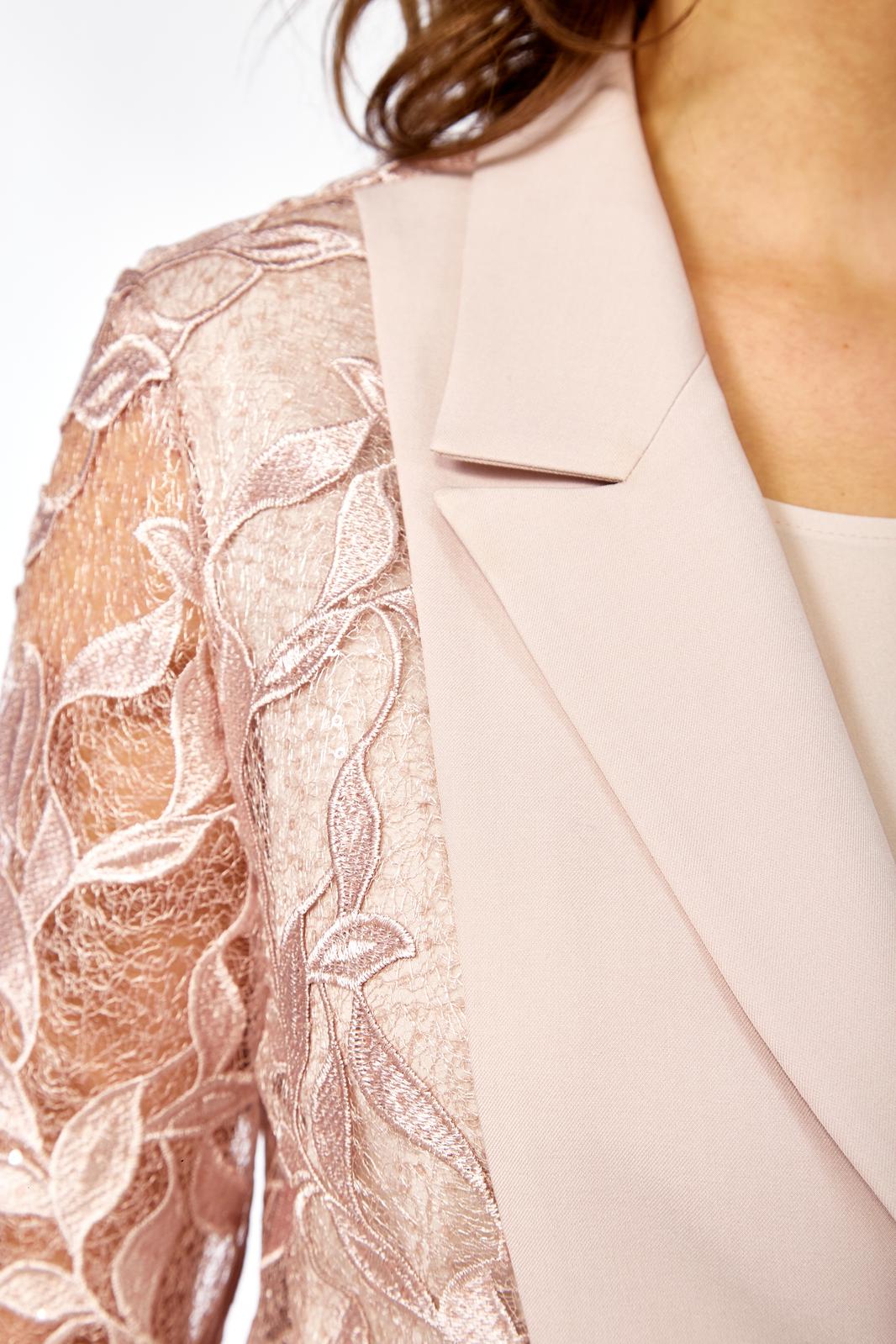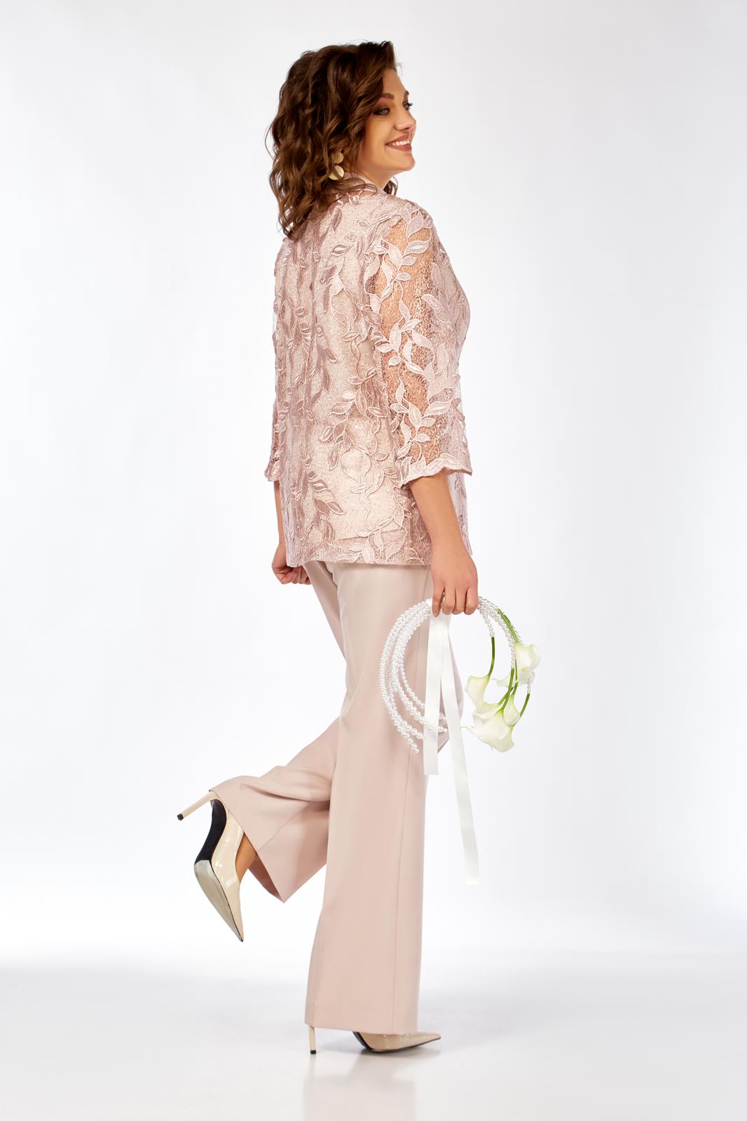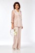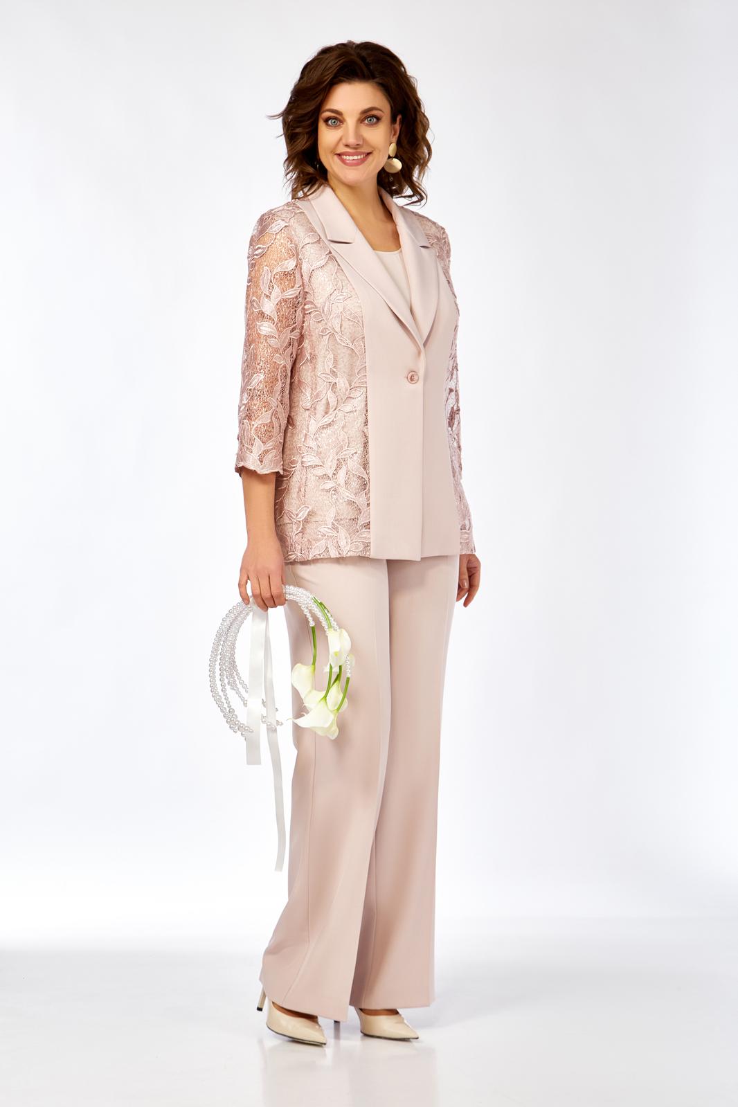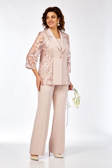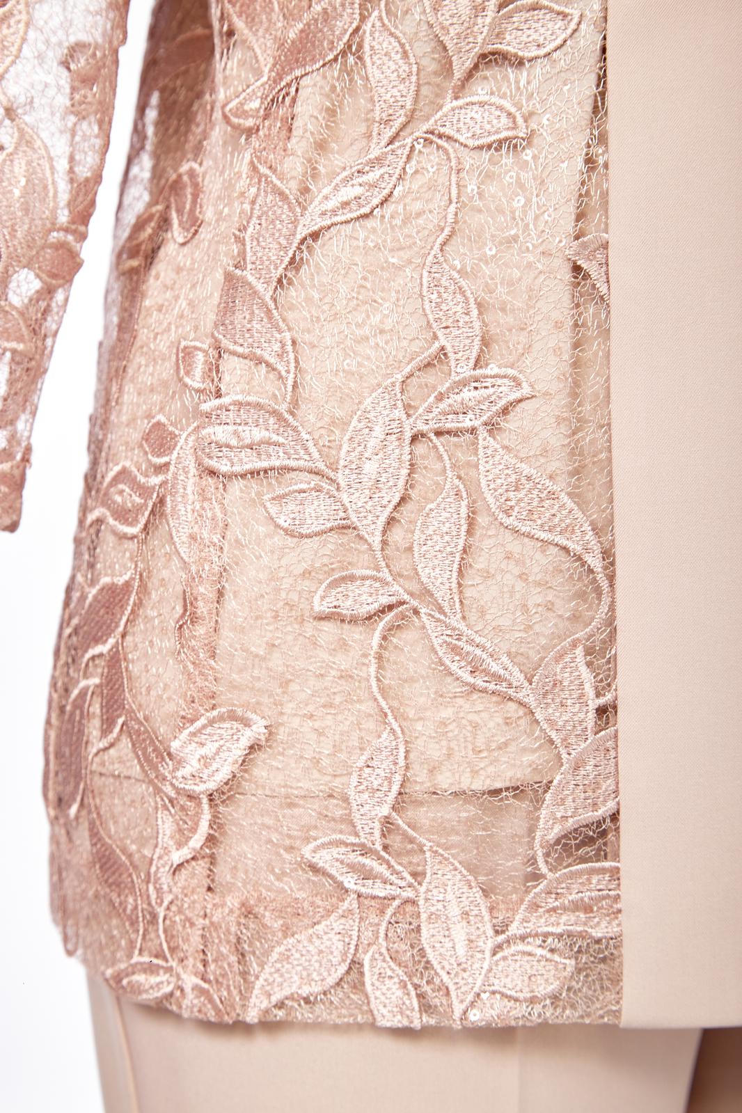 Комплект женский, нарядный, состоящий из жакета, брюк и блузки. Стильный жакет полуприлегающего силуэта с пиджачным воротником, с застежкой на одну пуговицу. Жакет выполнен из сочетания двух тканей- кружево и однотон. Спинка со средним швом. Рукав из кружевной ткани, длиной три четверти. Блузка без рукавов, с округлым вырезом горловины. По переду нагрудные вытачки. Брюки прямые, со стрелками, на поясе. По спинке пояс на резинке.