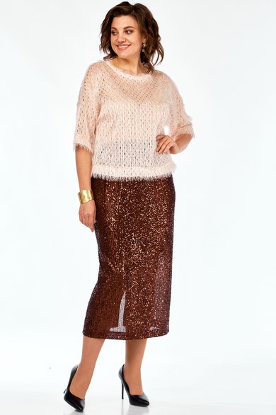 Шикарный комплект, сочетающий мягкую бахрому и паетки -must-have сезона. Блузка нарядная прямого силуэта, из интересной ткани с бахромой. Вырез горловины округлой формы, со спущеныным рукавом длиной 3/4. Юбка длиной миди на поясе (резинка по бокам) из отделочной атласной ткани. По спинке средний шов, в который вставлена потайная молния и заканчивающийся разрезом длиной выше колена. Юбка на подкладке.