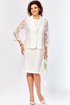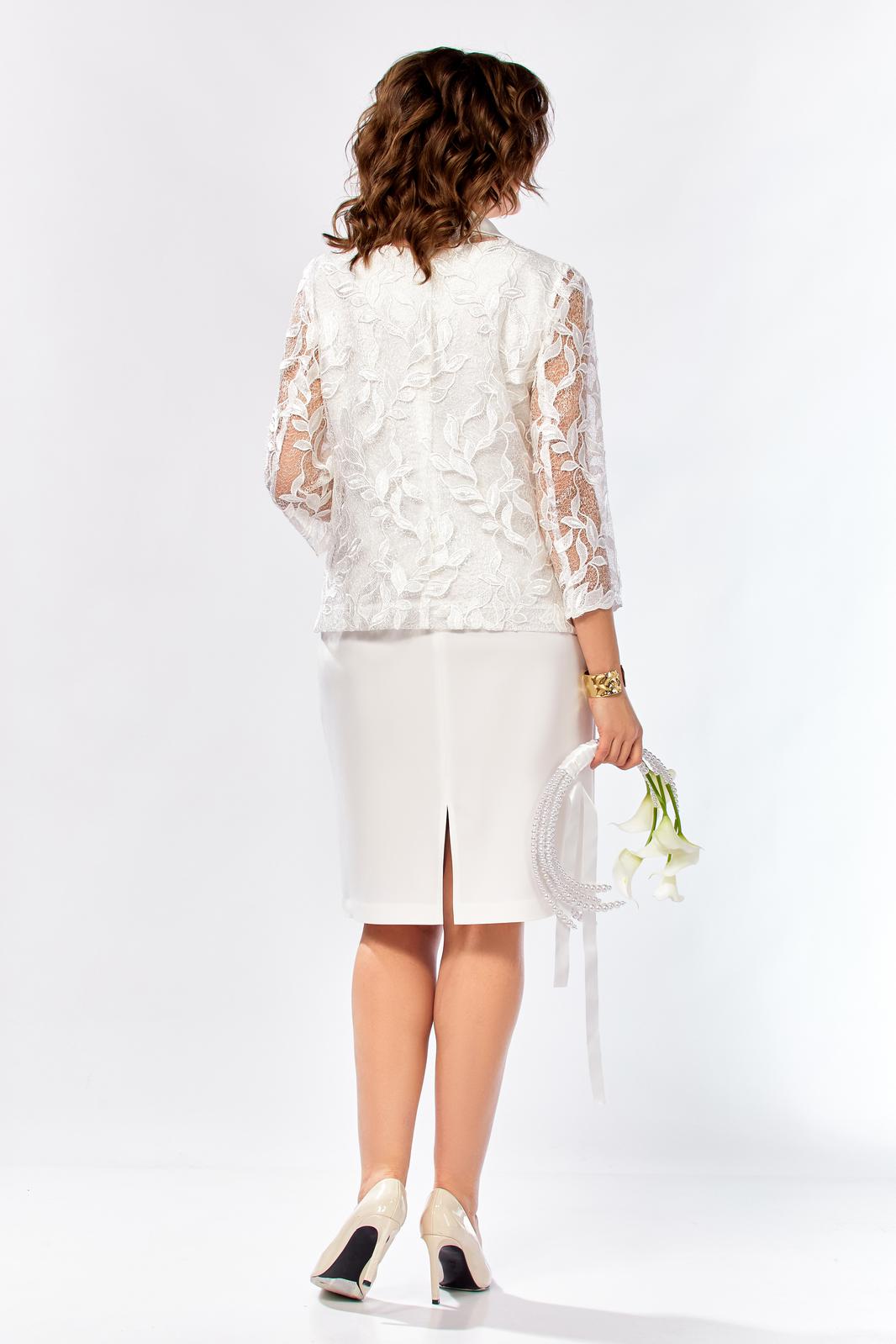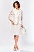 Нарядный комплект, состоит из жакета и платья. Жакет полуприлегающего силуэта с воротником пиджачного типа и застежкой на петлю и пуговицу. Жакет состоит из двух тканей- кружевное полотно и однотон. Спинка со средним швом. Рукав из кружевного полотна, длиной три четверти. Платье без рукавов, со средним швом по спинке, в котором потайная молния и разрез.