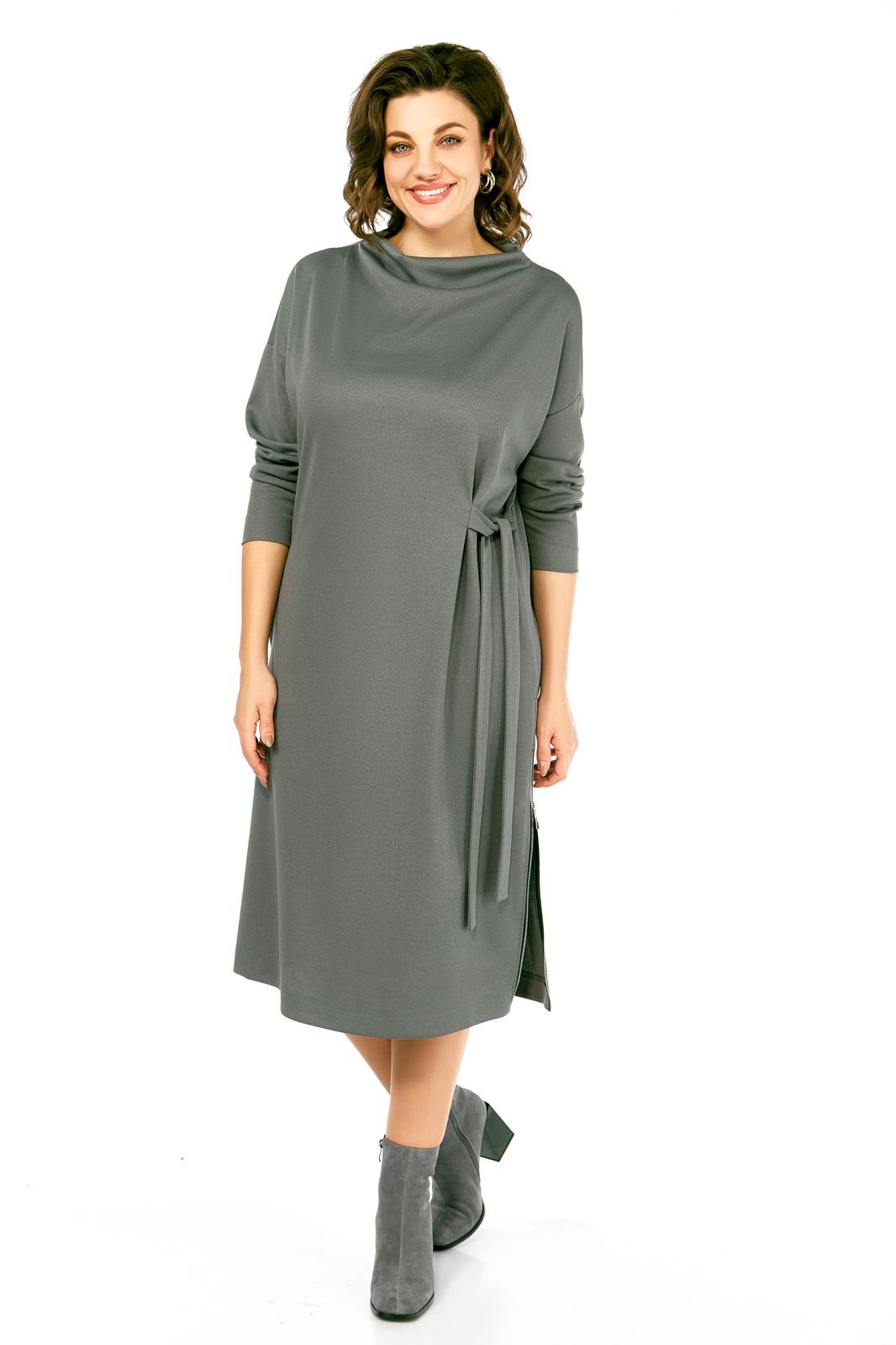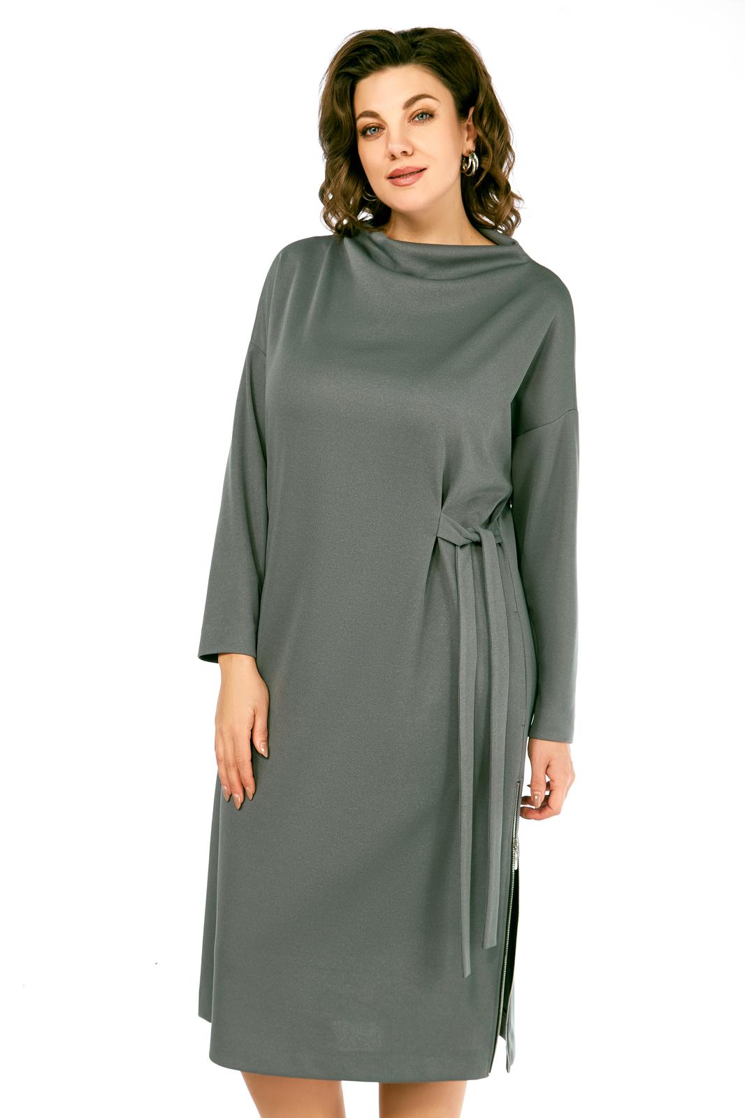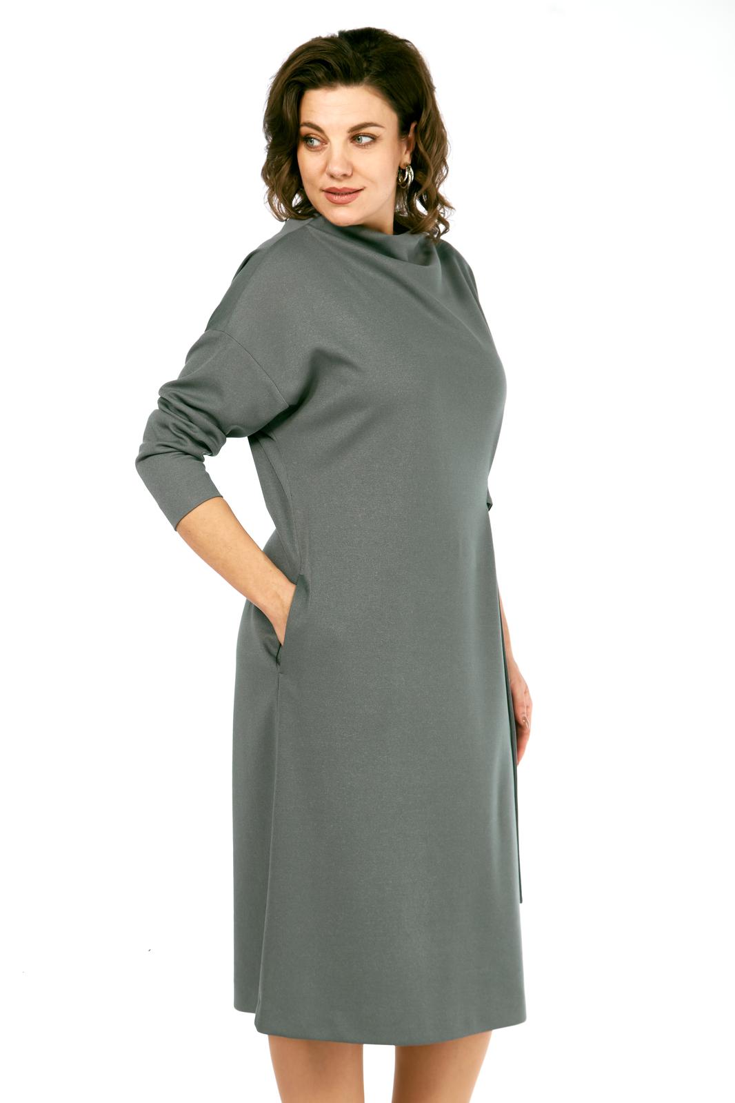 Платье женское, прямого силуэтв со спущенным длинным рукавом. Цельнокроенный воротник-стойка. Слевой стороны в области талии слева декор, в виде ниспадающего пояса. Карманы в боковых швах. Молния в левом боковом шве внизу функциональная молния, которая при растегивании превращается в разрез.