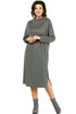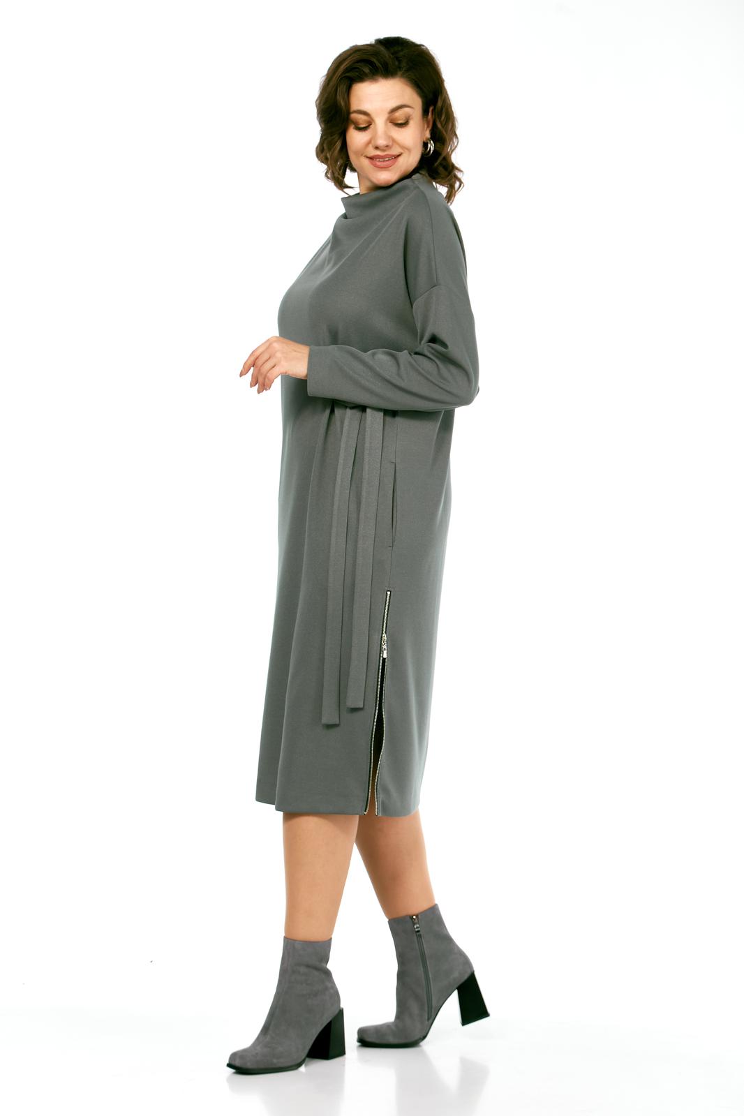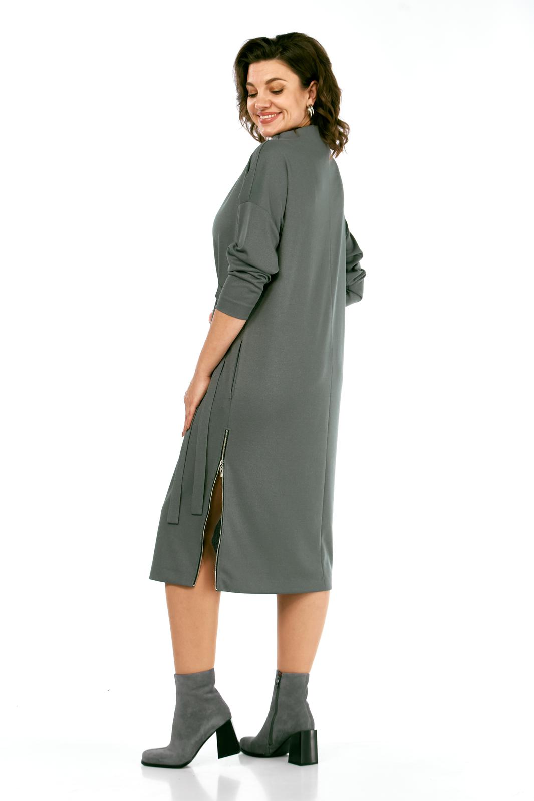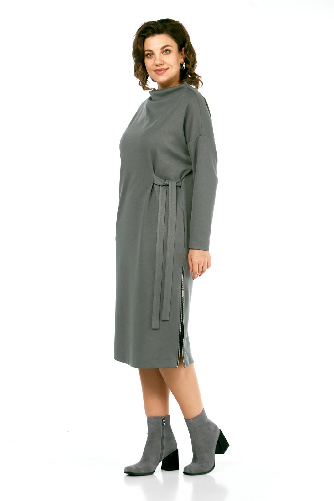 Платье женское, прямого силуэтв со спущенным длинным рукавом. Цельнокроенный воротник-стойка. Слевой стороны в области талии слева декор, в виде ниспадающего пояса. Карманы в боковых швах. Молния в левом боковом шве внизу функциональная молния, которая при растегивании превращается в разрез.