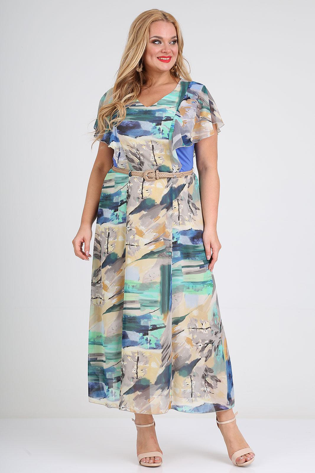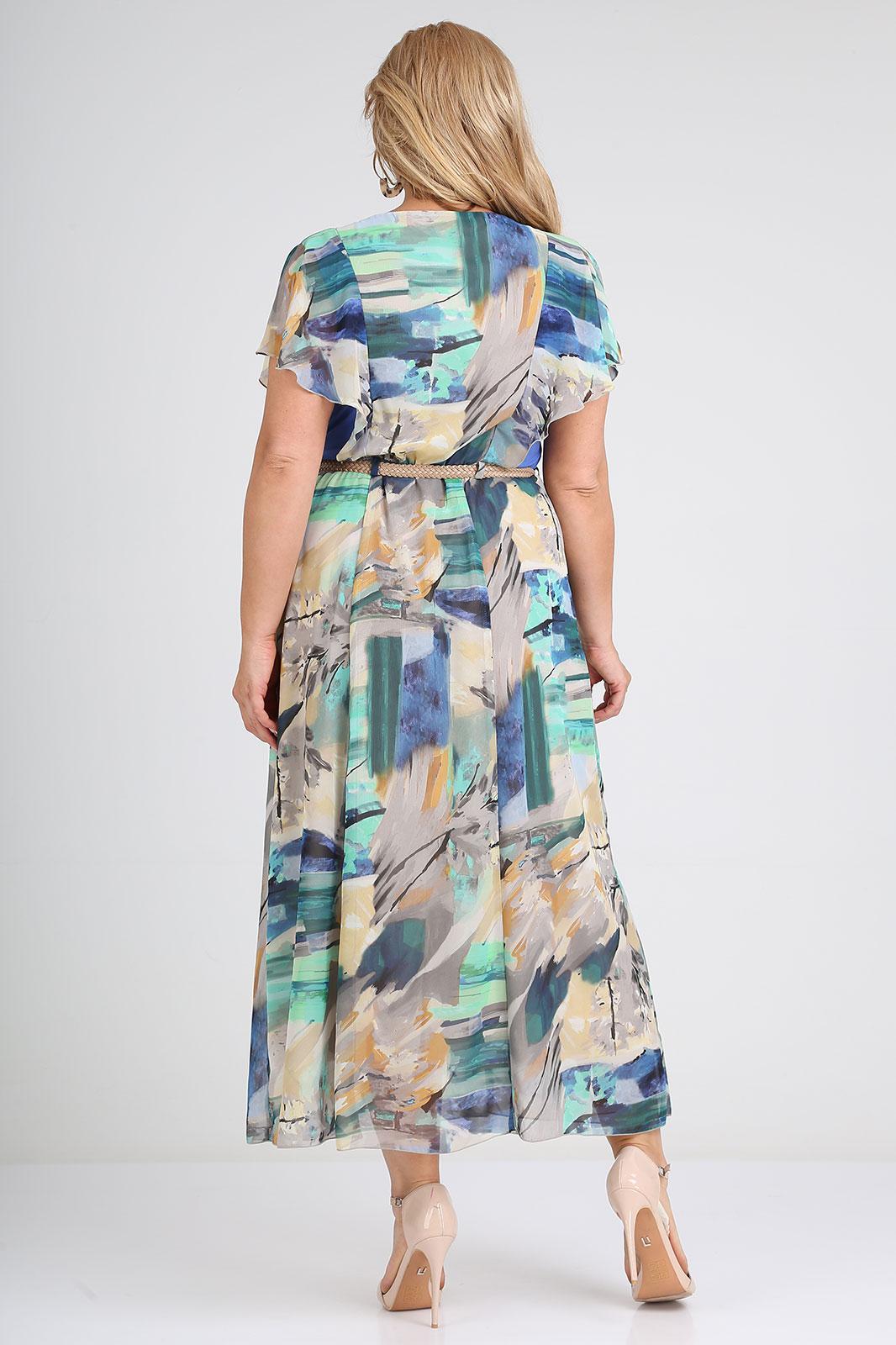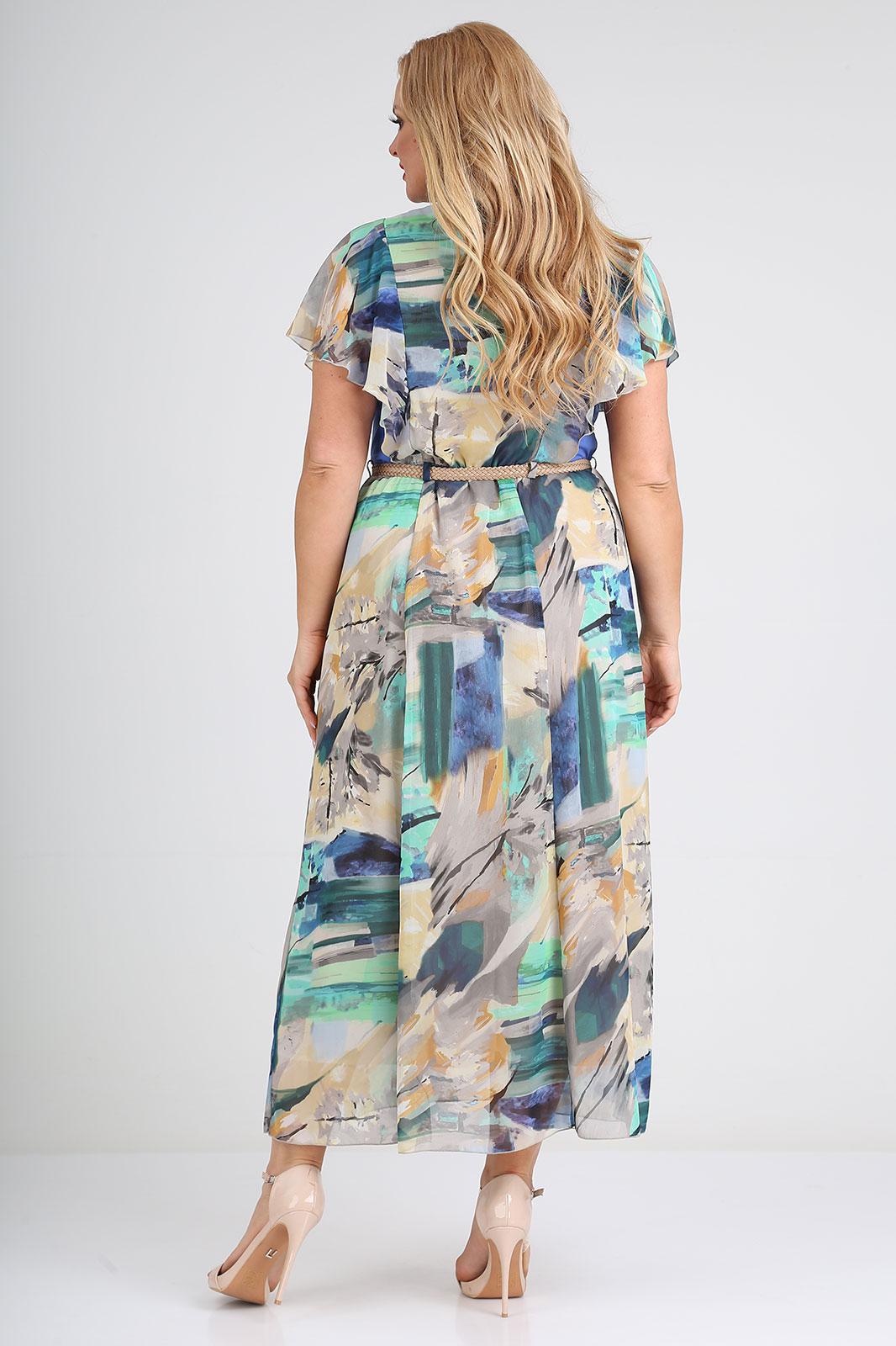Лёгкое шифоновое платье maxi. Вискозные однотонные вставки по бокам верхней части - визуально уменьшают объём и делают фигуру изящнее. Рукав «крылышко», расположен в шве вертикального рельефа от линии талии по переду, до линии талии по спинке. Модель дополнена плетеным поясом из искусственной кожи. Длина изделия: 50-56 размер – 134.0 см