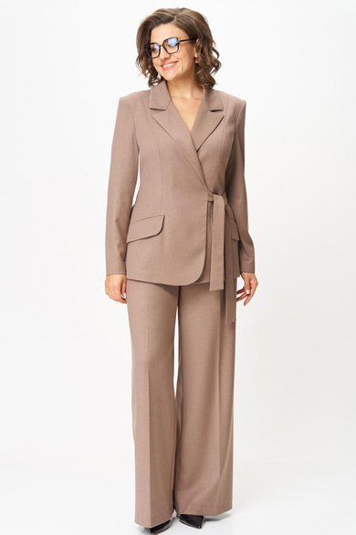 Жакет полуприлегающего силуэта с двубортной застежкой, завязывающейся на пояс. Воротник пиджачного типа. Рукав длинный, двушовный, втачной, плечо слегка расширено. Спинка со средним швом и рельефом из плечевого шва. По переду полурельеф из плеча, заканчивающийся вытачкой, обработаны прорезные карманы с листочкой и клапаном. Низ борта закругленный.