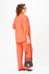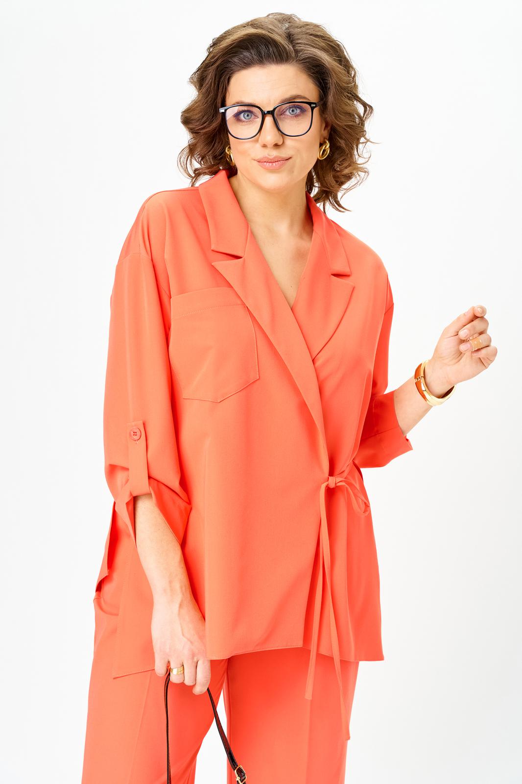 Жакет прямого силуэта, удлиненный, со спущенными плечами. Жакет двубортный, с застежкой на завязывающиеся шнурки. Горловина оформлена воротником пиджачного типа. В верхней правой части переда накладной карман, по боковым швам высокие разрезы, низ переда и спинки фигурный. Спинка со средним швом. Рукава прямые, одношовные, длина ¾. Низ рукава можно подвернуть и зафиксировать хлястиком, застегивающимся на отдельную пуговицу.
