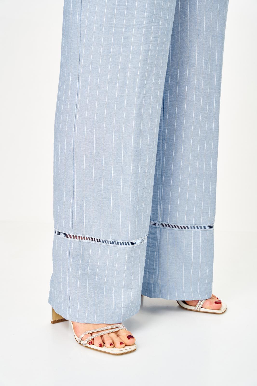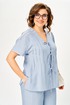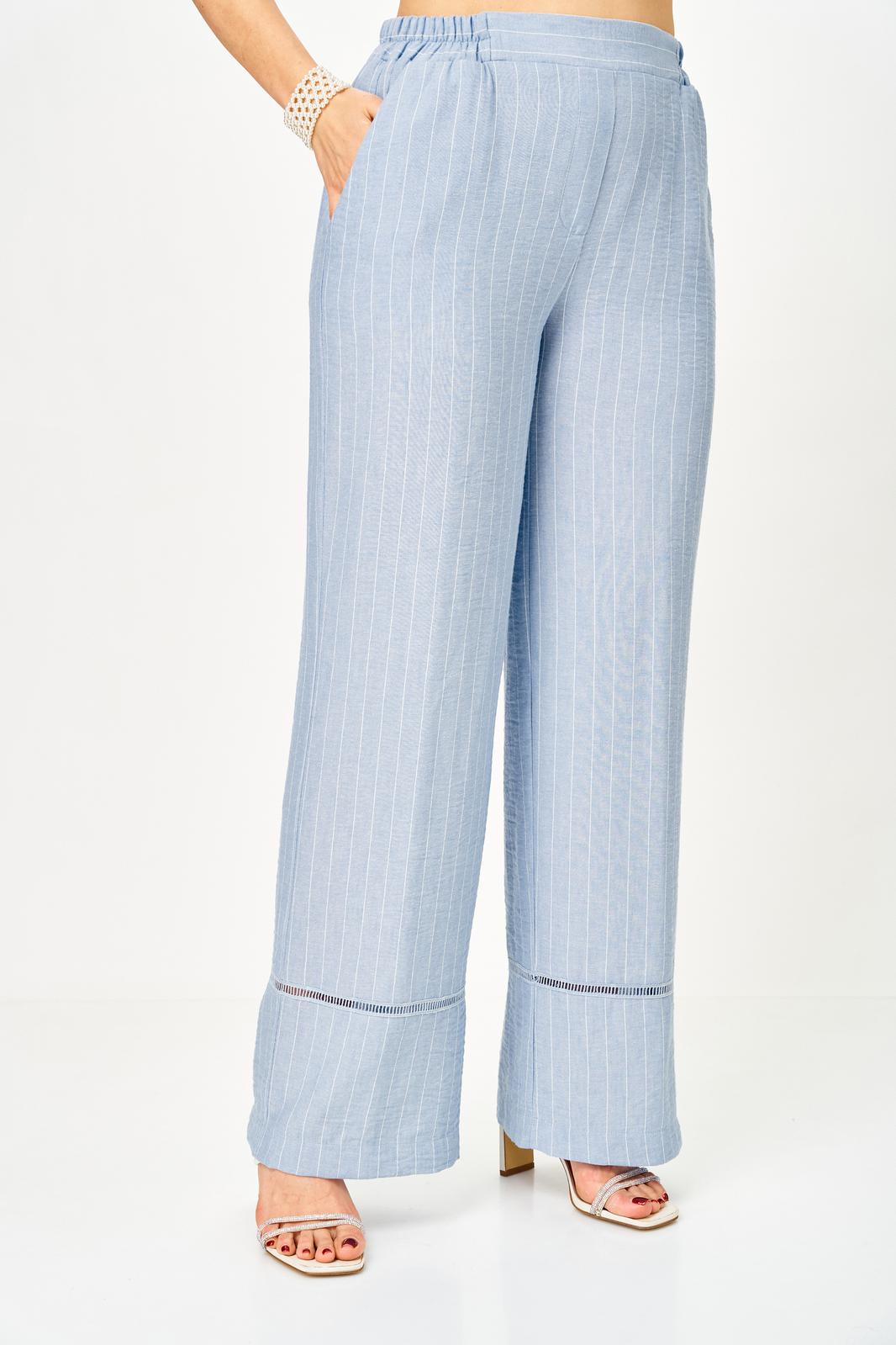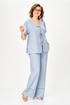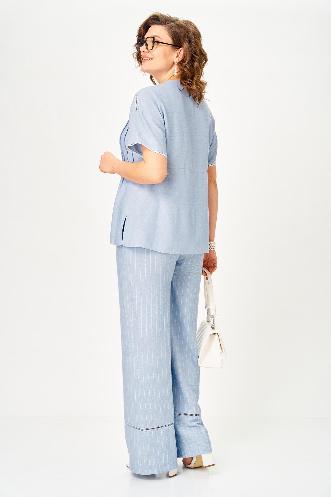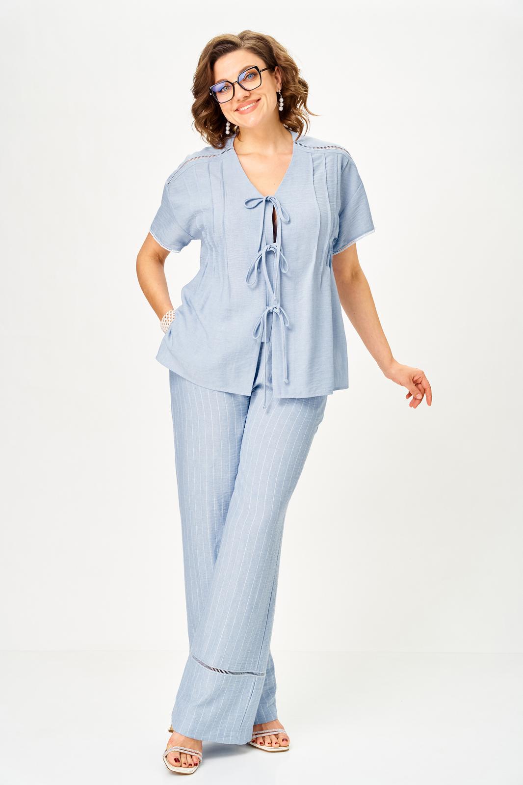 Комплект женский, состоящий из блузы и брюк, выполнен из однотонной ткани в полоску (брюки) из костюмной ткани.