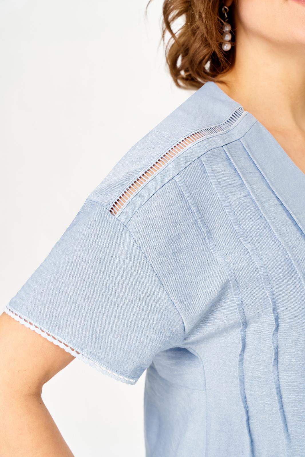 Блуза свободного покроя со спущенным плечом, слегка расширенная книзу. Блуза имеет У-образный вырез и застежку в виде завязывающихся шнурков с потайной планкой. Перед с отрезной кокеткой, параллельно которой вставлена отделочная тесьма. От кокетки вниз застрочены защипы, по боковым швам разрезы. Спинка отрезная чуть выше линии талии, нижняя часть слегка расширена. Рукав спущенный, по низу пришита декоративная тесьма.