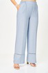 Брюки прямые, свободной формы, по низу отрезные, с декоративной тесьмой. Верхний срез брюк обработан поясом, с резинками по боковым швам и имитацией застежки. В боковых швах выполнены наклонные карманы.