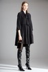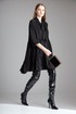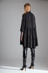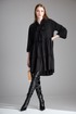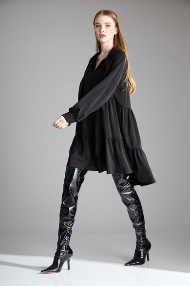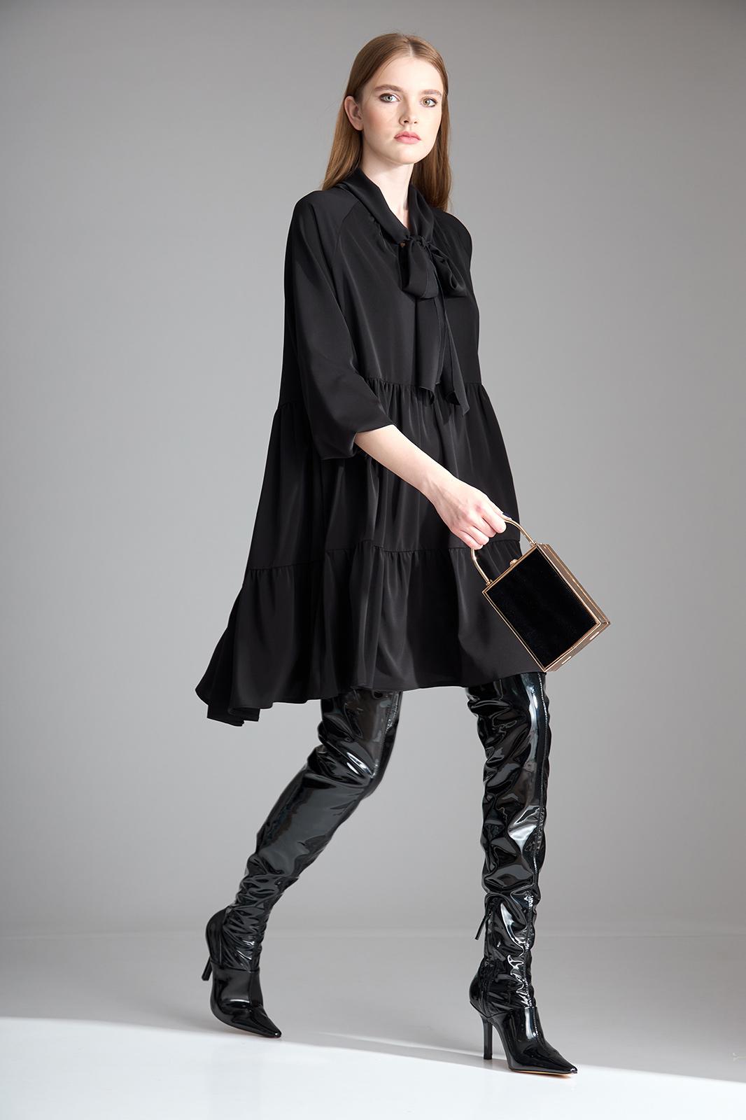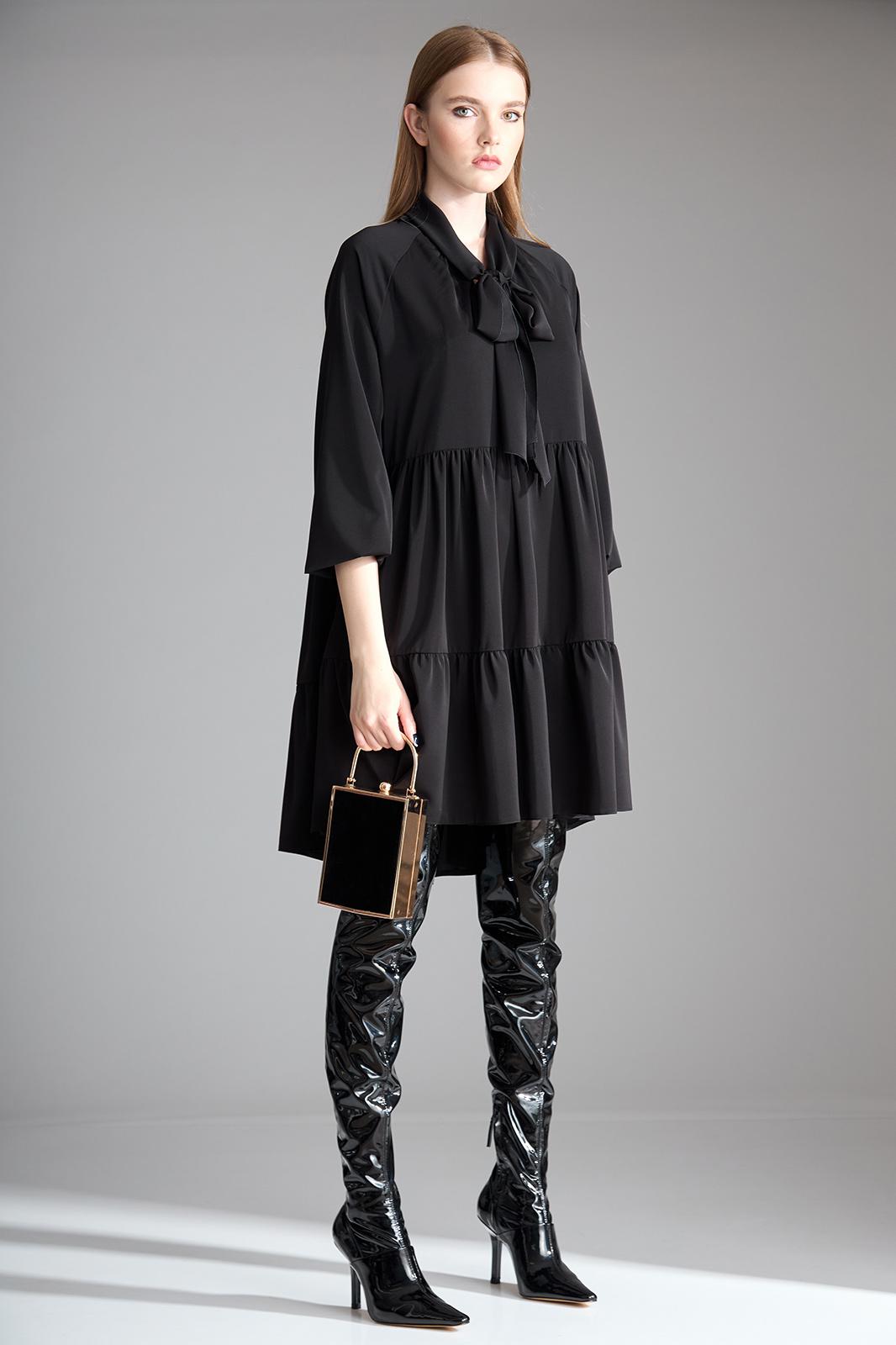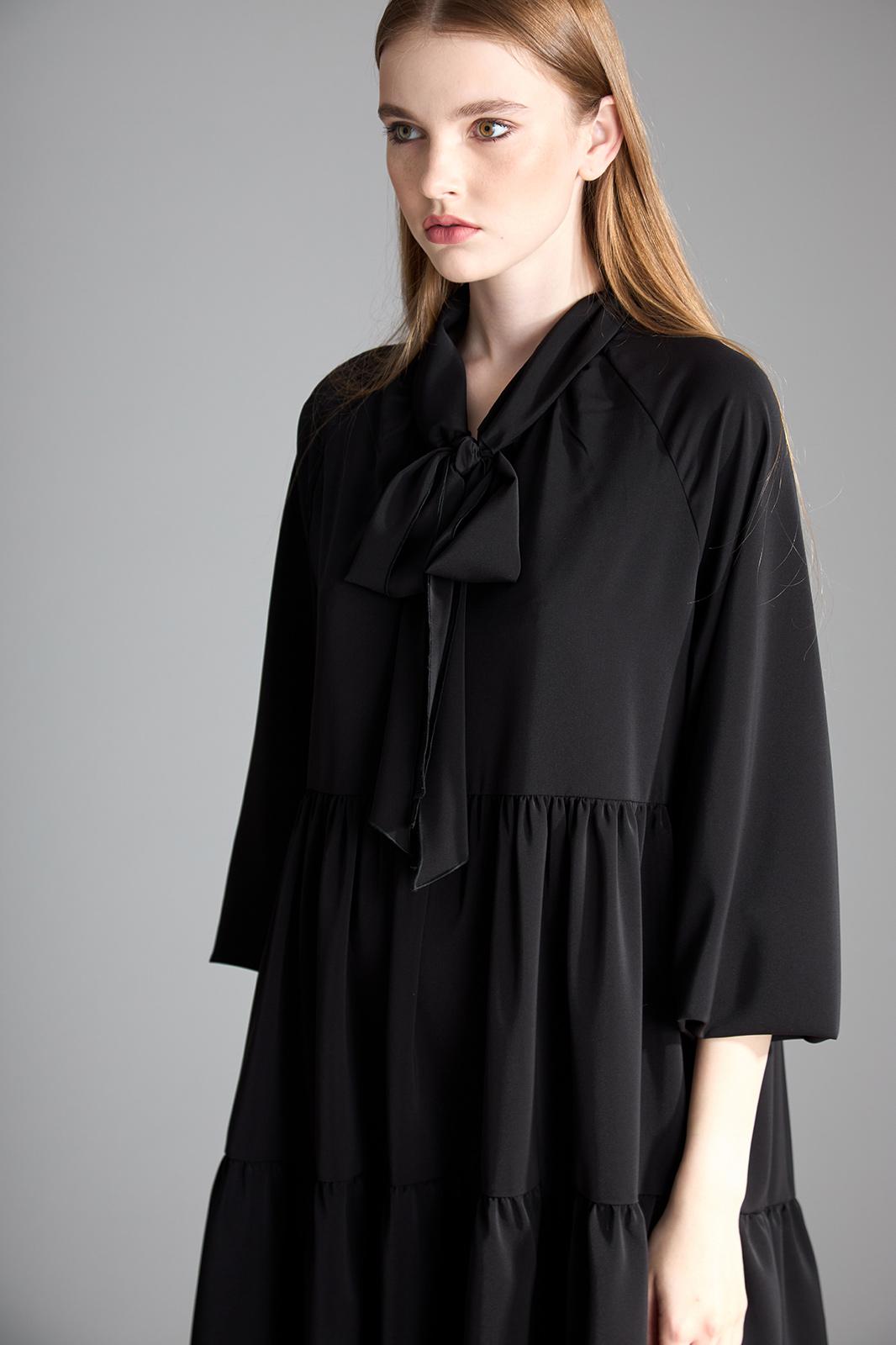 платье выполнено из ткани (п/э 64%, виск 33%, п/у 3%). Платье трапециевидной формы с 2-мя воланами на легкой сборке. Воротник стойка, переходящая в бант. Рукав реглан, длинный с притачной манжетой. На манжете вставка с использование ликры. Длина платья по центру спинки 91 см, по переду длина 82см.