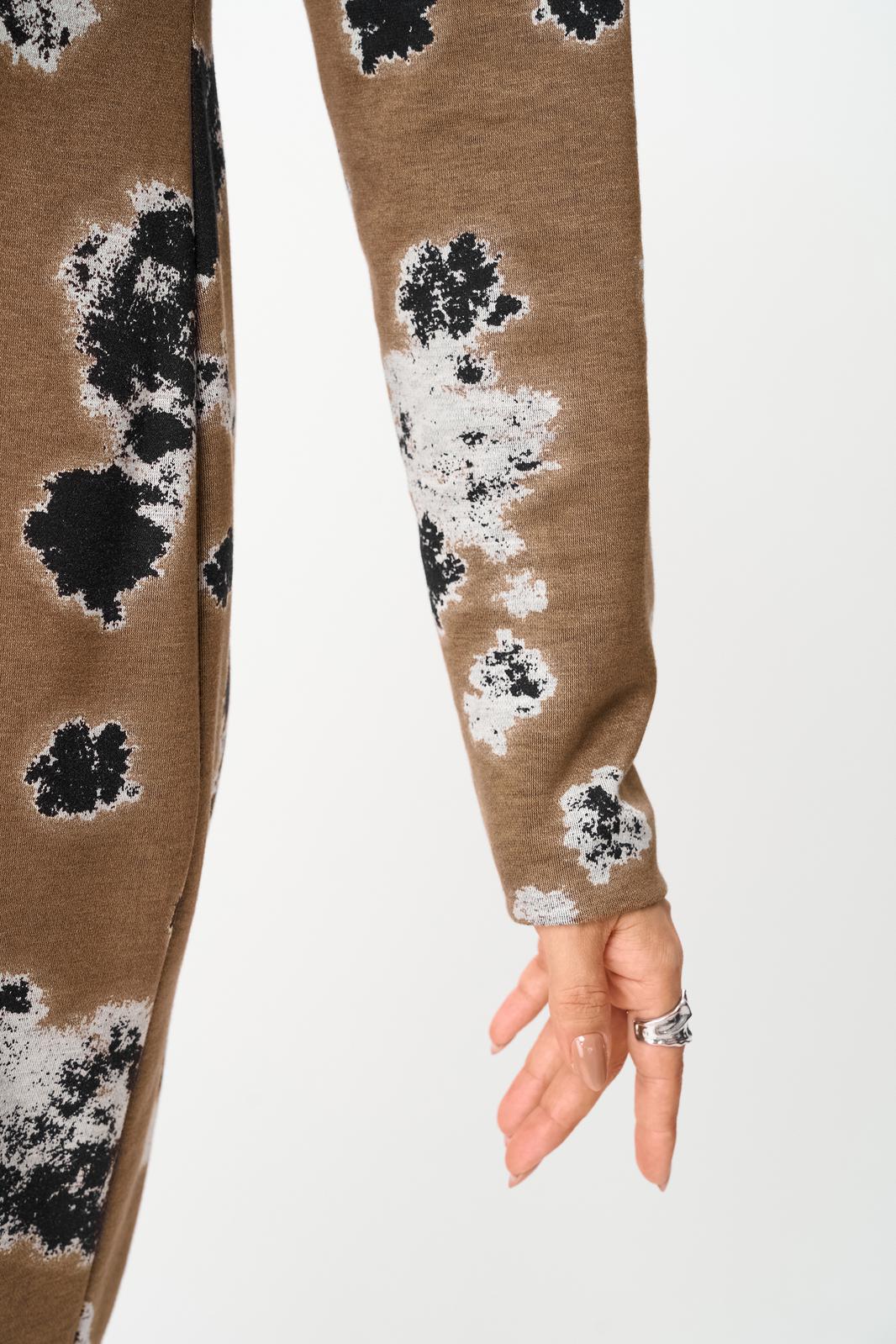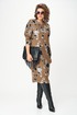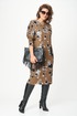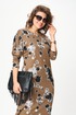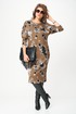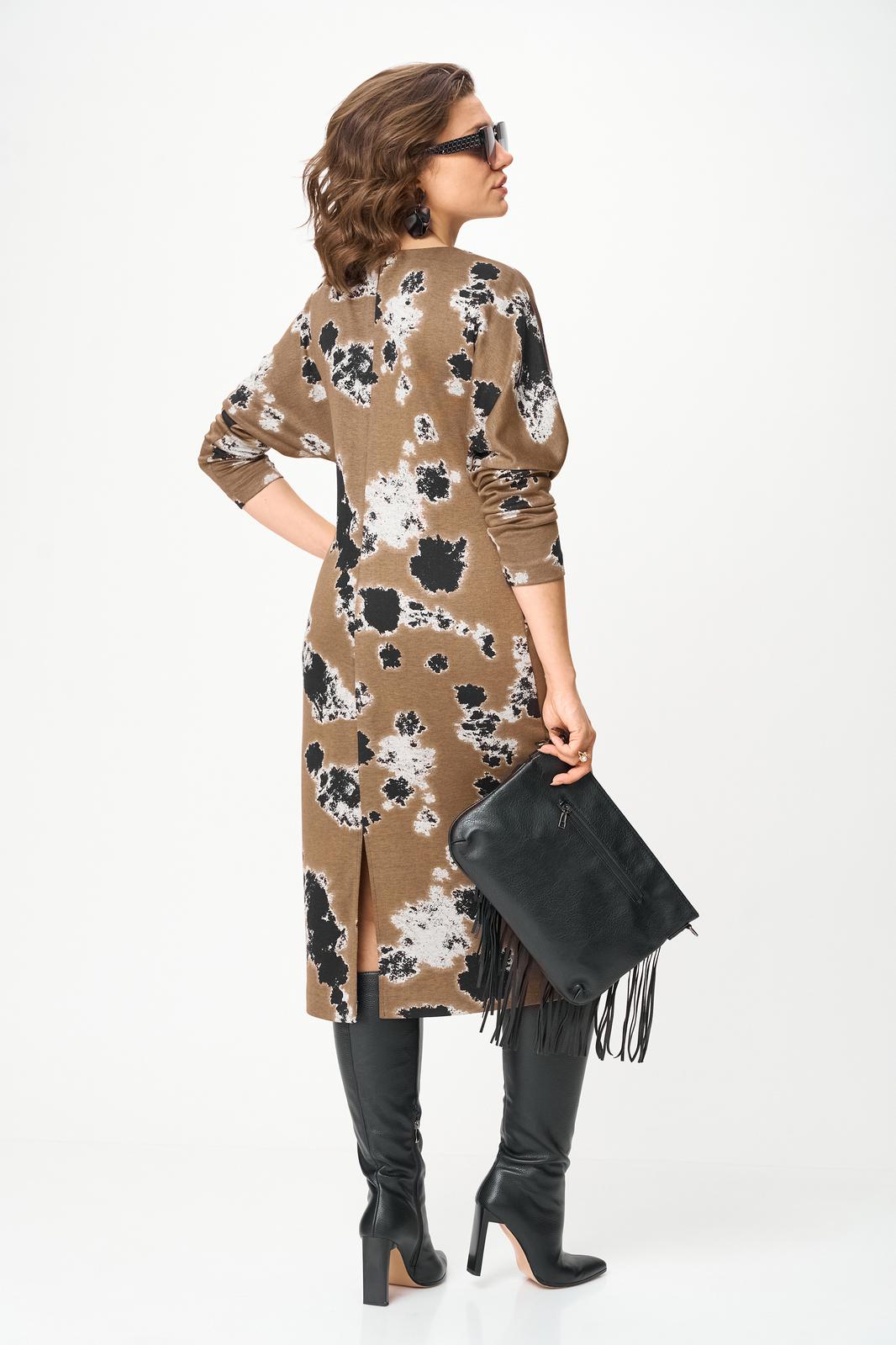 Платье женское полуприлегающего силуэта, выполнено из трикотажного полотна с принтом. Горловина в платье округлой формы, оформлена обтачкой, по спинке застегивается на навесную петлю и пуговицу. Спинка со средним швом, талиевыми вытачками и разрезом. Рукава цельнокроеные с нижней отрезной частью.