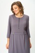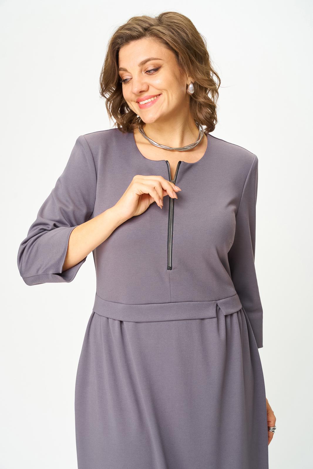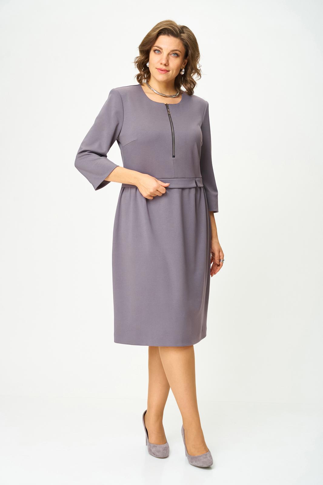 Платье женское полуприлегающего силуэта, втачного покроя рукава, выполнено из трикотажного полотна. По переду платье отрезное по линии талии, в шов вставлена горизонтальная планка, с уголком в левой части. Нижняя часть переда на сборке в боковых частях. Верхняя часть переда со швом по центру, в который вставлена отделочная молния, а так же с нагрудными вытачками из боковых швов. Горловина округлой формы. Спинка со средним швом и талиевыми вытачками. Рукав ¾ двухшовный, с небольшим разрезом по локтевому шву.