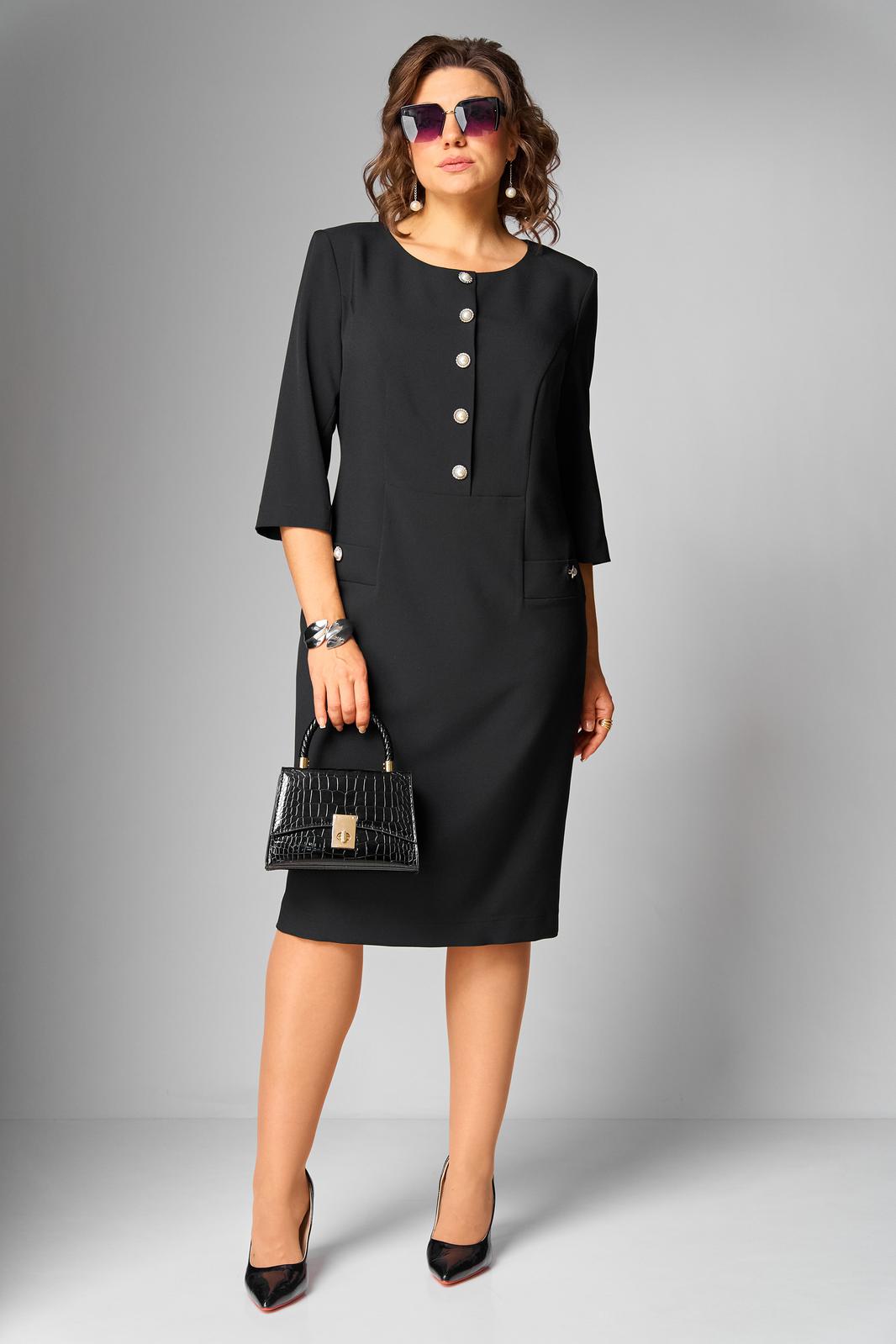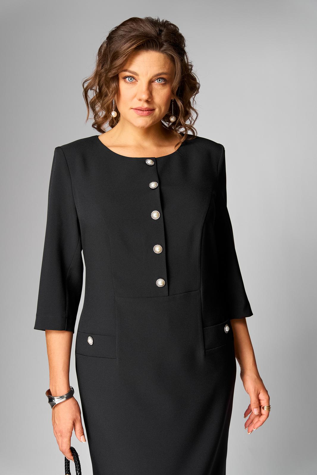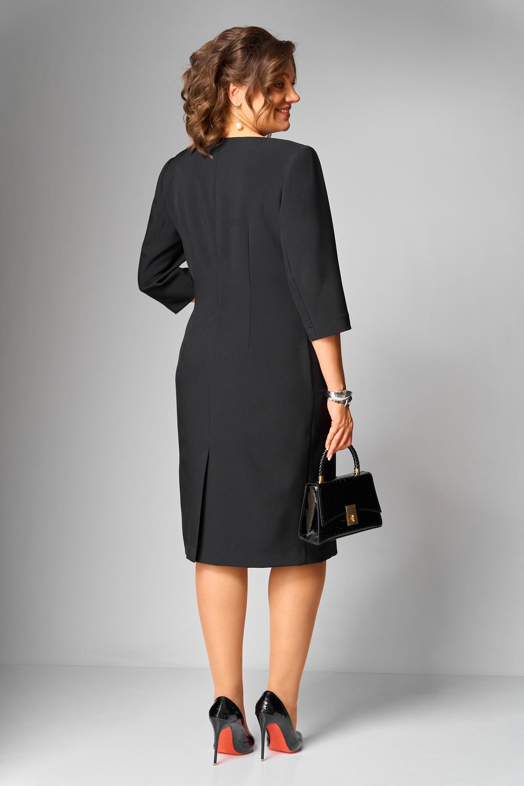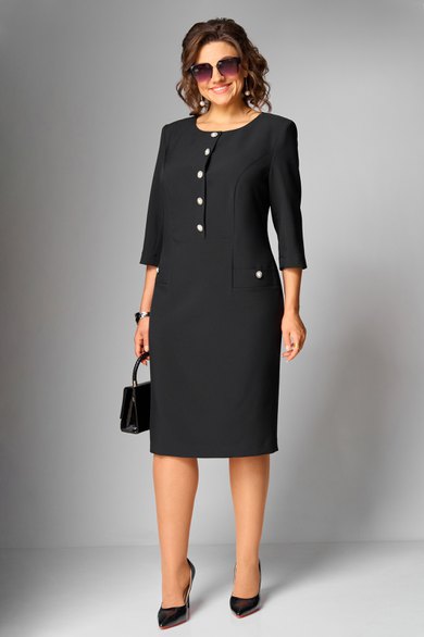 Платье женское полуприлегающего силуэта, втачного покроя с имитацией застежки по переду до подрезной линии, в бочках расположены листочки. Горловина округлой формы, рукава ¾ длины, двухшовные. Спинка со средним швом, в котором расположена тесьма «молния» и шлица, а так же вертикально направленные талиевые вытачки. Платье выполнено из однотонной ткани костюмно-плательной группы.