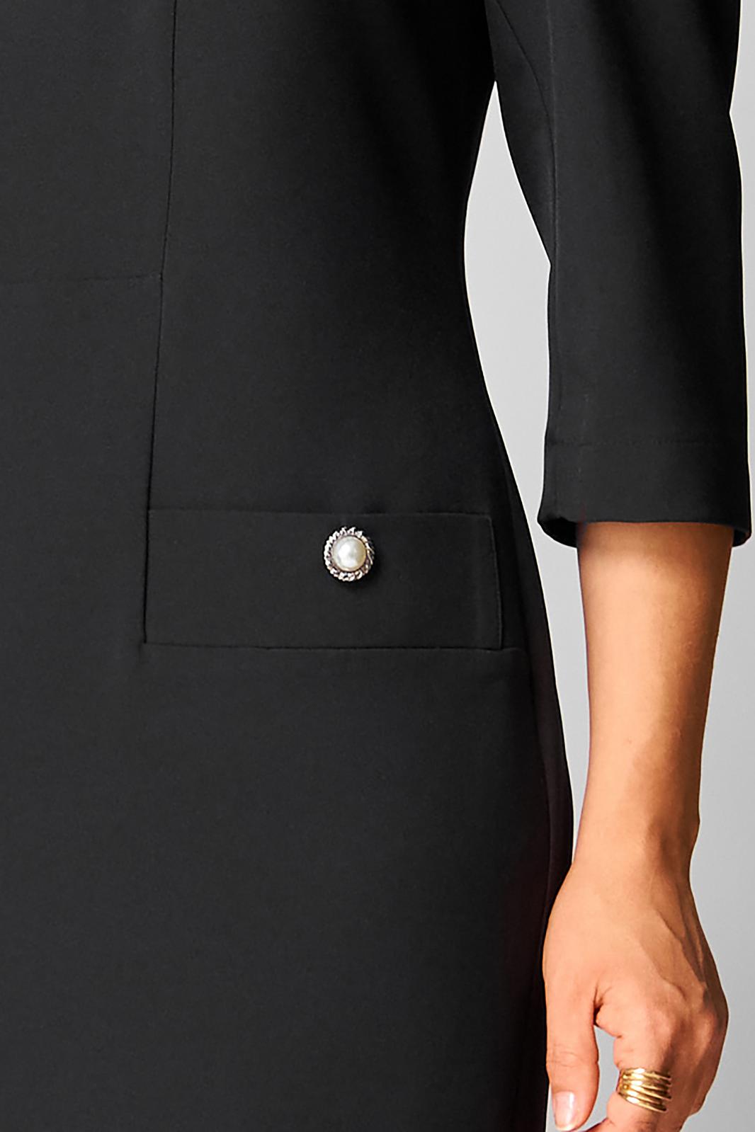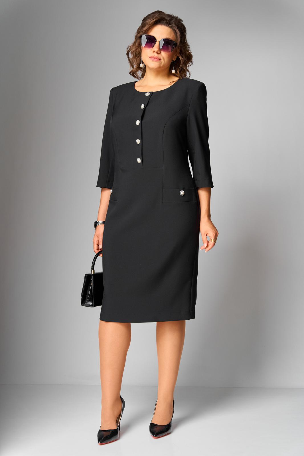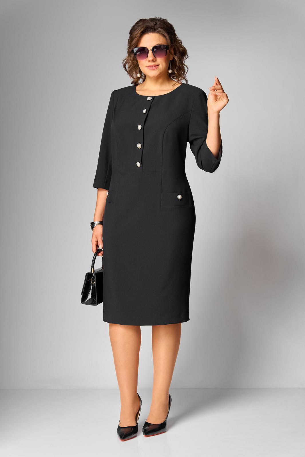 Платье женское полуприлегающего силуэта, втачного покроя с имитацией застежки по переду до подрезной линии, в бочках расположены листочки. Горловина округлой формы, рукава ¾ длины, двухшовные. Спинка со средним швом, в котором расположена тесьма «молния» и шлица, а так же вертикально направленные талиевые вытачки. Платье выполнено из однотонной ткани костюмно-плательной группы.