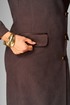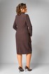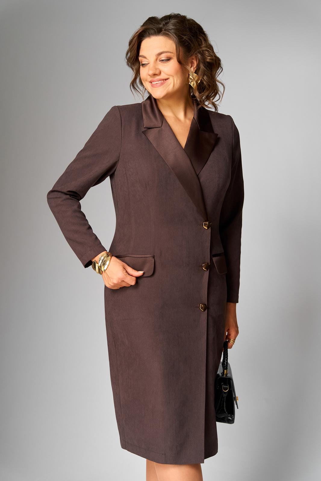 Платье женское, полуприлегающего силуэта, зауженное к низу, с двубортной застежкой (правая часть имеет слегка наклонную линию) на 3 отделочные пуговицы. На спинке средний шов, заканчивающийся шлицей и талиевые вытачки. По переду отрезной бочок, заканчивающийся в области бедер и нагрудная вытачка, в горизонтальном подрезе, в котором выполнен прорезной карман с двумя рамками и клапаном. Горловина оформлена воротником пиджачного типа. Рукав втачной, одношовный, длинный. Воротник, лацкан, клапаны и рамки кармана из атласной ткани.