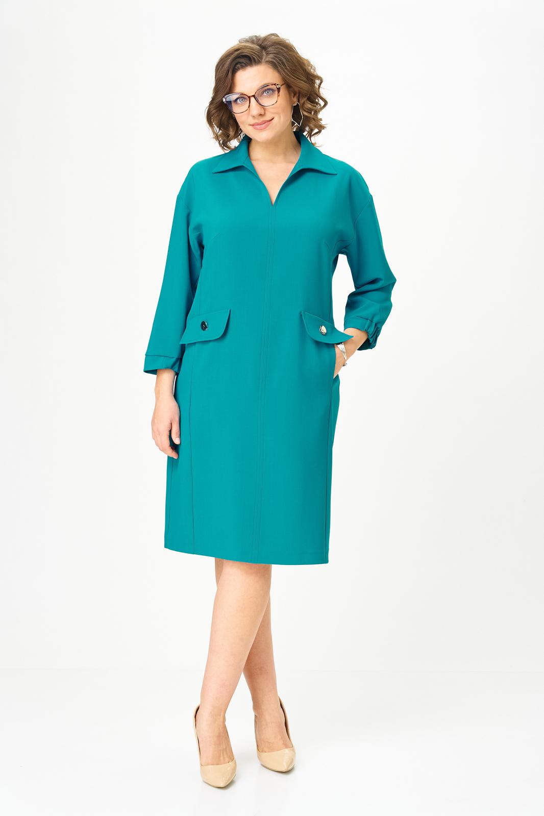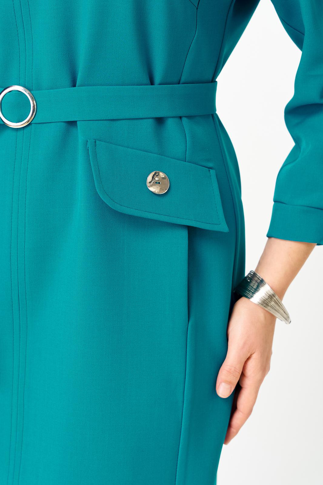 По переду центральный шов, сверху переходящий в вырез, а так же бочок из проймы, с нагрудной вытачкой, с карманами в шве в нижней части платья. Над карманом пришит клапан с декоративной пуговицей. Воротник стояче-отложной. Спинка со средним швом, снизу заканчивающимся разрезом. Рукав рубашечного покроя, одношовный, длиной 7/8, к низу притачивается манжета – на половину собранная на резинку. К платью прилагается съемный пояс с отделочной пряжкой.