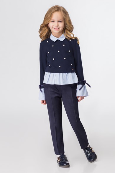 Стильный модный джемпер для девочки из хлопкового трикотажного полотна с отделкой из хлопковой ткани с рисунком в полоску. Джемпер прямого силуэта, с сорочечным воротником из хлопковой ткани с рисунком в полоску, с застежкой на петлю и пуговицу на воротнике. Рукава втачные длинные, по низу рукава притачен манжет из хлопковой ткани с рисунком в полоску. Над манжетами настрочена атласная лента, которая завязывается в декоративный бантик. По переду джемпер украшен бусинками. Джемпер отлично сочетается как с брюками, так и с юбками. Такой джемпер станет прекрасным выбором школьника.
