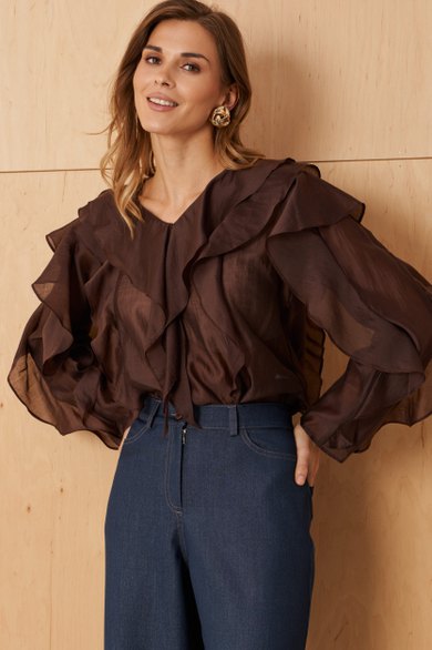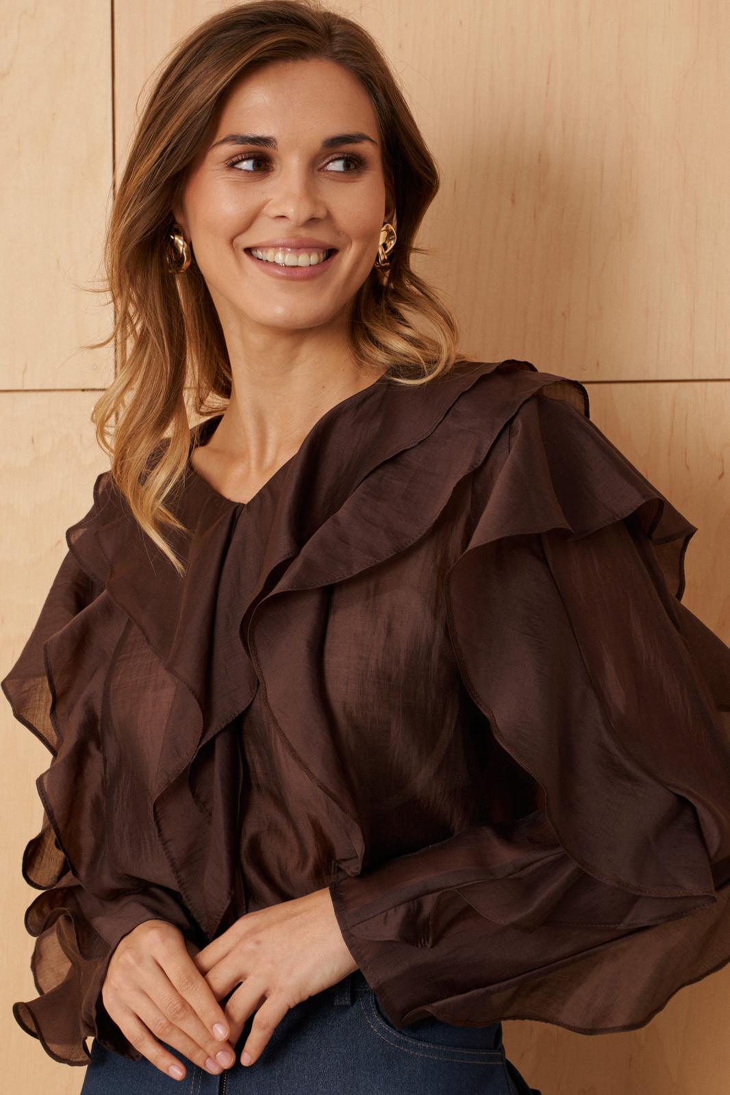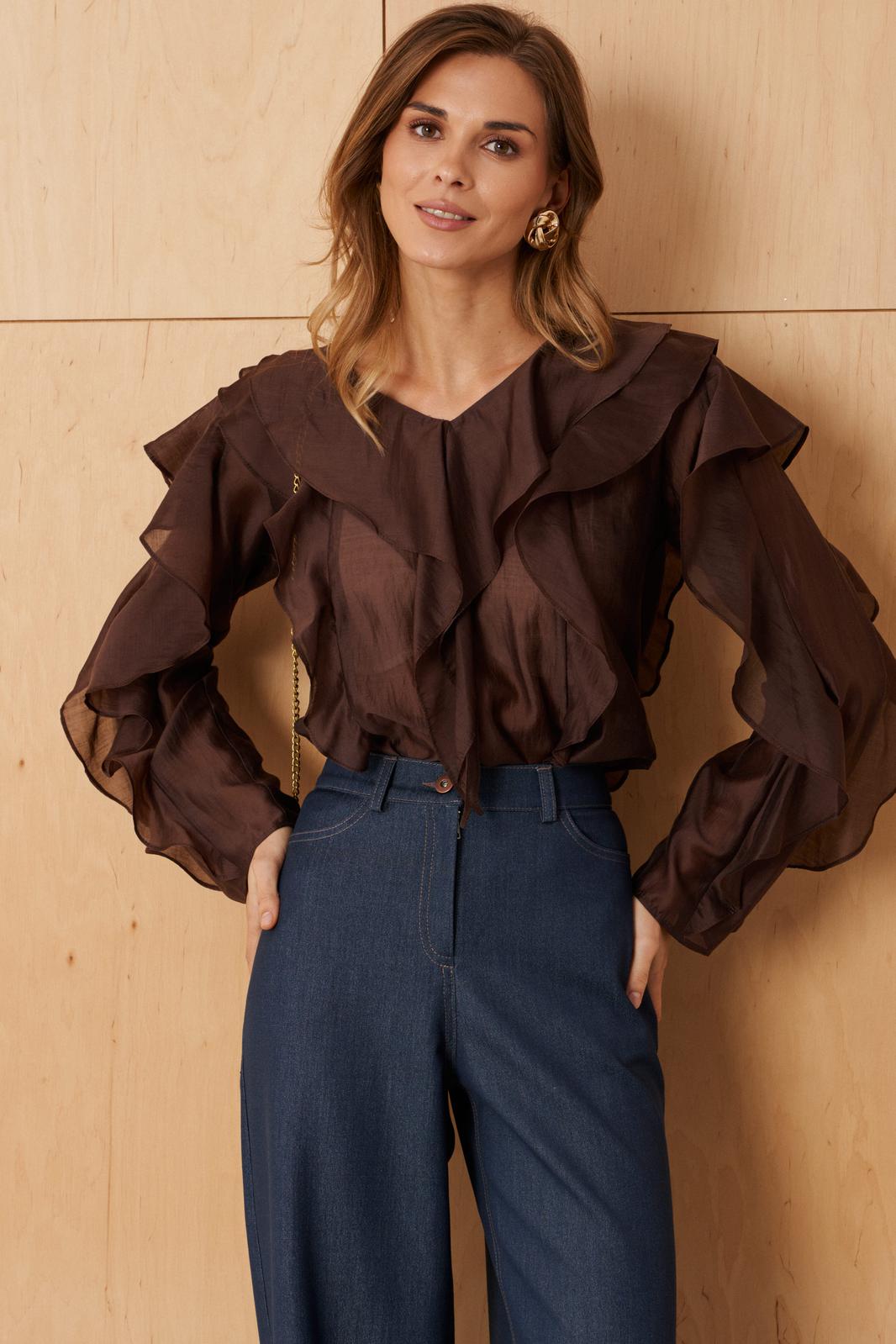 Эта блузка шоколадного оттенка идеально подойдет для повседневных образов — она сочетает комфорт, стиль и женственность, позволяя выглядеть элегантно в любой ситуации.