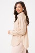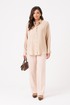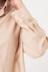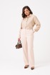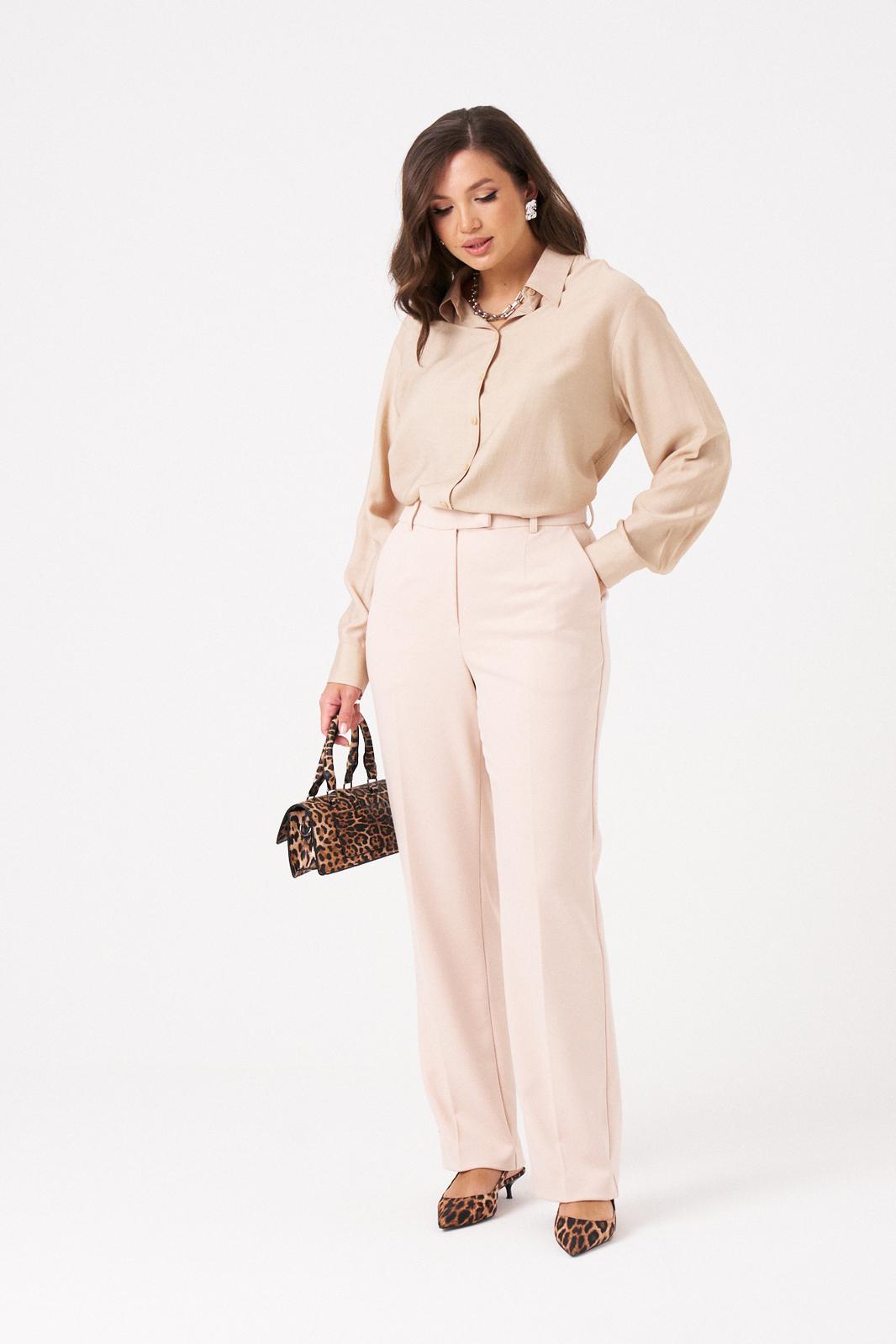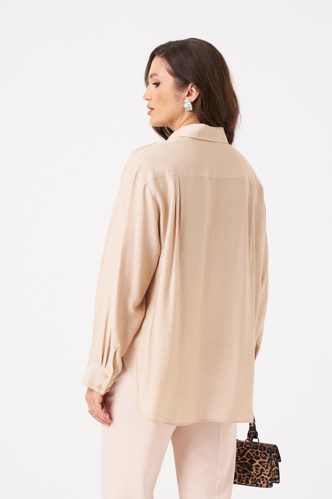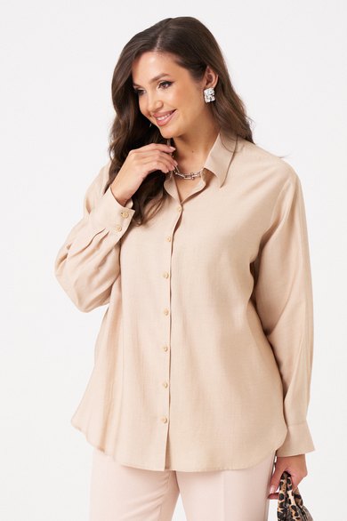 Эта женская блузка выполнена из легкой и воздушной поливискозной ткани с добавлением шерсти, что обеспечивает приятную мягкость и комфорт при носке. Ее бежевый оттенок делает образ нежным и универсальным, идеально подходящим для повседневных ситуаций. Застежка центральная бортовая на обметанные петли и пуговицы обеспечивает удобство и аккуратный внешний вид. Низ переда выполнен в полукруглой форме, а спинка украшена кокеткой и складками, что добавляет изящества. Низ спинки также полукруглый, а боковые швы оснащены разрезами для дополнительного комфорта и стиля. Горловина оформлена рубашечным воротником с отрезной стойкой, придавая образу классический вид. Длинные втачные рукава завершены притачными манжетами с застежками на обметанные петли и пуговицы, что позволяет регулировать их длину и создавать аккуратный силуэт. Эта блузка идеально подойдет для создания повседневных образов — она сочетает комфорт, стиль и женственность, позволяя выглядеть элегантно в любой ситуации.