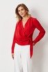 Женская блузка из струящейся ткани чёрного цвета, идеально подходящая для повседневной носки. Модель выполнена на запах, что придаёт ей элегантность и удобство. Передняя часть украшена складками в плечевом шве, а также дополнительными складками, образующимися за счёт передней детали, продеваемой через перемычку. Спинка имеет отрезную кокетку и небольшие складки для комфортной посадки. Горловина V-образная, подчёркивающая линию шеи. Рукава втачные, длинные. Низ рукава оформлен притачной манжетой с застёжкой на обмётанную петлю и пуговицу,