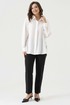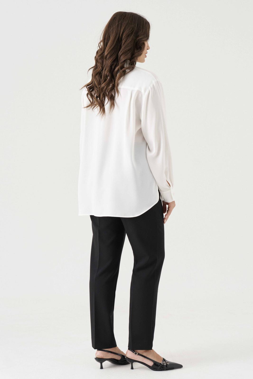 Блуза из струящейся ткани для повседневной носки. Блуза прямого силуэта с длинным втачным рукавом оформленным притачной манжетой. Воротник отложной, застежка фронтальная потайная на пуговицы. Длина блузы классическая.
