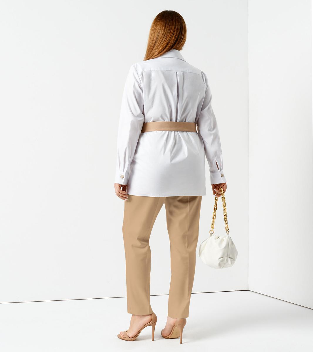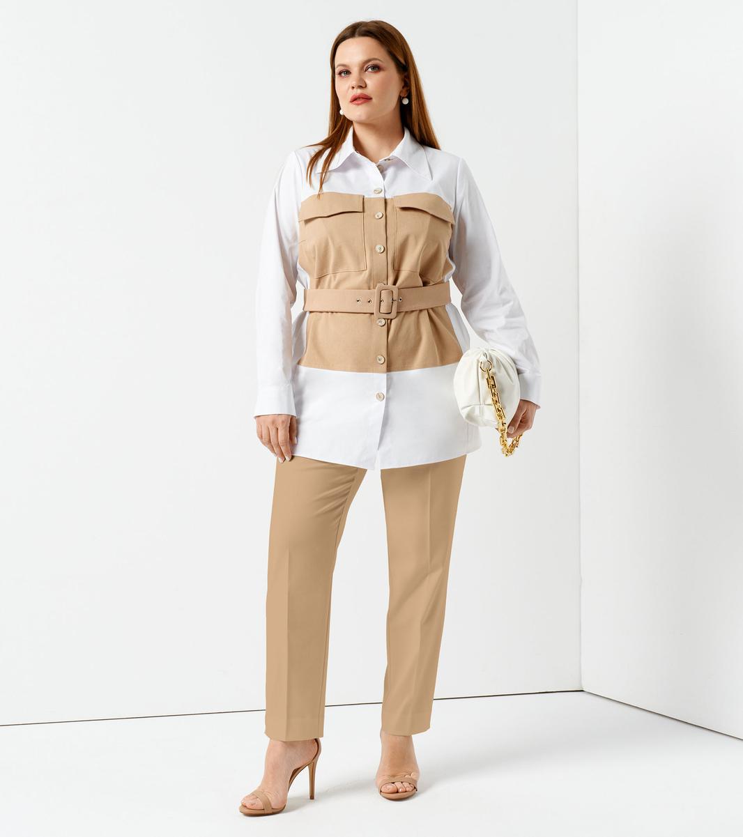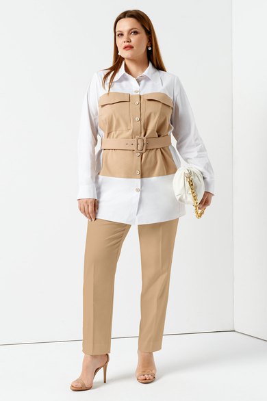 Блузки женские с поясом делают фигуру стройнее, а талию – визуально уже. Данная модель в белом и бежевом цветах выглядит нарядно, а также смещает акценты с живота на грудь и плечи. Надев ее в сочетании с брюками или юбкой-карандашом на работу, вы вызовете восхищенные взгляды коллег. Удлиненная хлопковая блузка с отложным воротником застегивается на пуговицы, имеет два крупных нагрудных кармана с клапанами и длинный втачной рукав, оканчивающийся манжетой. Поспешите купить женскую блузку большого размера оригинального кроя и дизайна по доступной цене.