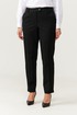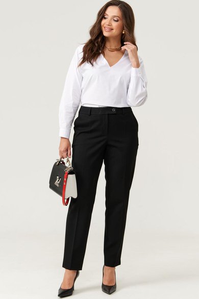 Эти женские брюки из поливискозной ткани идеально подходят для повседневной носки. Верхний срез брюк обработан притачным поясом, внутренний срез пояса украшен декоративной тесьмой, что придает изделию аккуратный и стильный вид. Застежка на одну обметанную петлю и одну пуговицу, а также имеется застёжка на тесьму-молнию в среднем шве брюк. Пояс дополнен шлёвками, позволяющими носить их с ремнём для дополнительной регулировки посадки и комфорта. Задняя часть брюк оснащена двумя талиевыми вытачками, обеспечивающими хорошую посадку по фигуре. Также имеется прорезной карман с двумя обтачками, добавляющий функциональности и эстетики. В боковых швах расположены боковые прорезные карманы с подкройным бочком, что делает эти брюки практичными для ежедневных нужд. В боковом шве имеются небольшие разрезы. Чёрный оттенок делает их универсальным элементом гардероба, сочетающим стиль и практичность.
