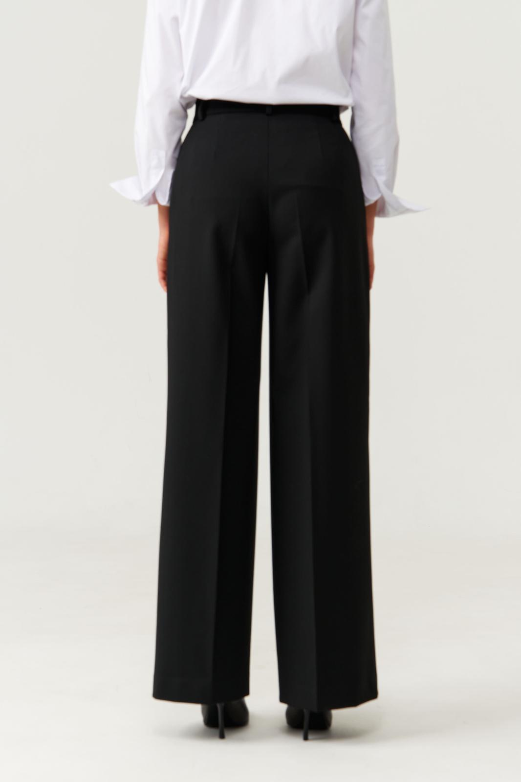 Верхний срез брюк обработан притачным поясом с застежкой на крючок и молнией в среднем шве, что обеспечивает надежную посадку и аккуратный внешний вид. Брюки оснащены шлевками, позволяющими дополнительно регулировать посадку по талии. Задняя часть украшена четырьмя талиевыми вытачками, которые создают хорошую посадку и подчеркивают фигуру.