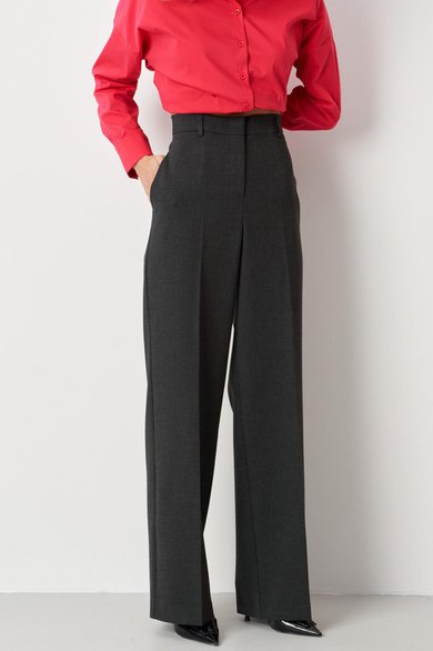Эти женские брюки выполнены из костюмной поливискозной ткани тёмно-серого цвета, идеально подходящей для повседневных образов. Их классический крой и нейтральный оттенок делают их универсальным элементом гардероба.