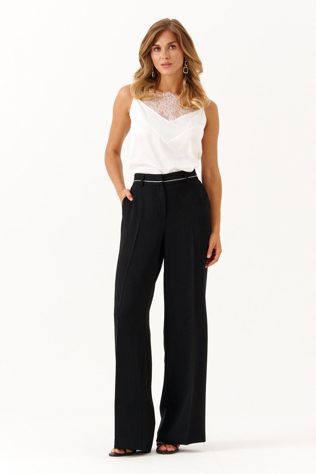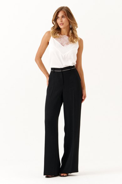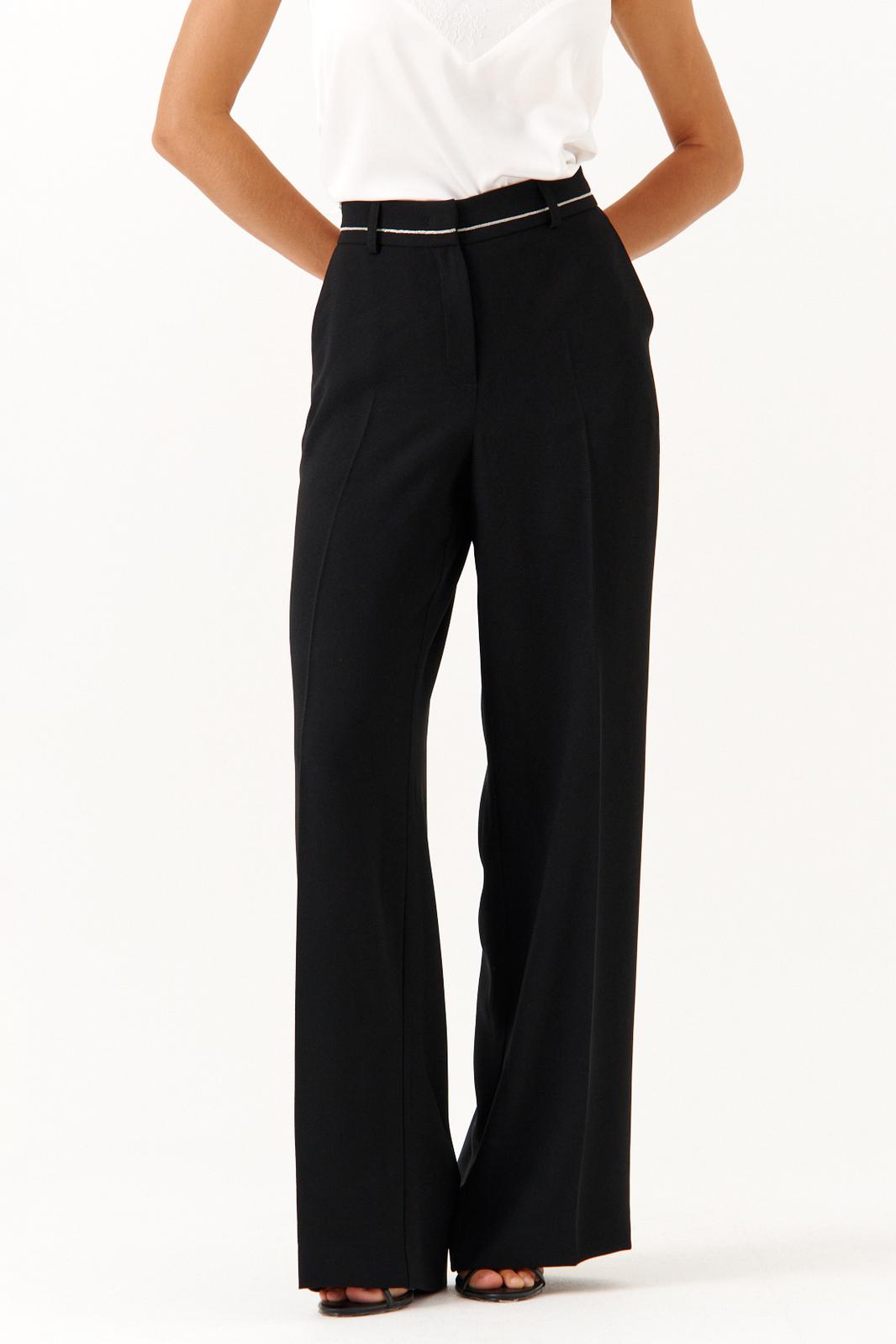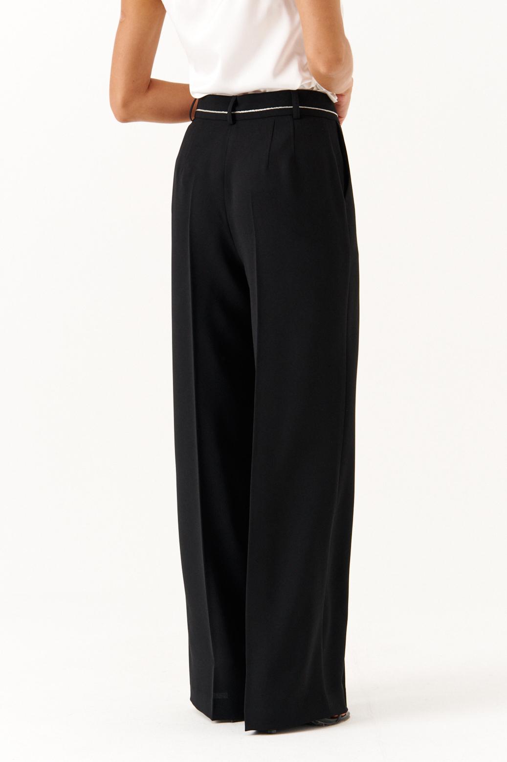 Эти женские брюки выполнены из легкой, струящейся ткани, идеально подходящей для повседневной носки и торжественных случаев. Модель обладает свободным кроем, обеспечивающим комфорт и свободу движений, а классическая длина делает образ элегантным и современным. В боковых швах расположены карманы с подкройным бочком, что добавляет функциональности и аккуратности. Верхний срез оформлен притачным поясом с втачной тесьмой по центру. В брюках расположены шлёвки для ремня, позволяющие регулировать объем по талии и подчеркивать фигуру. Застёжка расположена в среднем шве и выполнена на молнии с крючком, что обеспечивает удобство и надежность закрепления. Задние половинки брюк имеют две талиевые вытачки, что придает посадке аккуратность и форму. Эти брюки отлично сочетаются с различными топами и обувью, легко создавая стильные и легкие образы для любого дня.