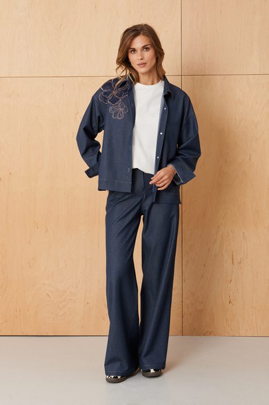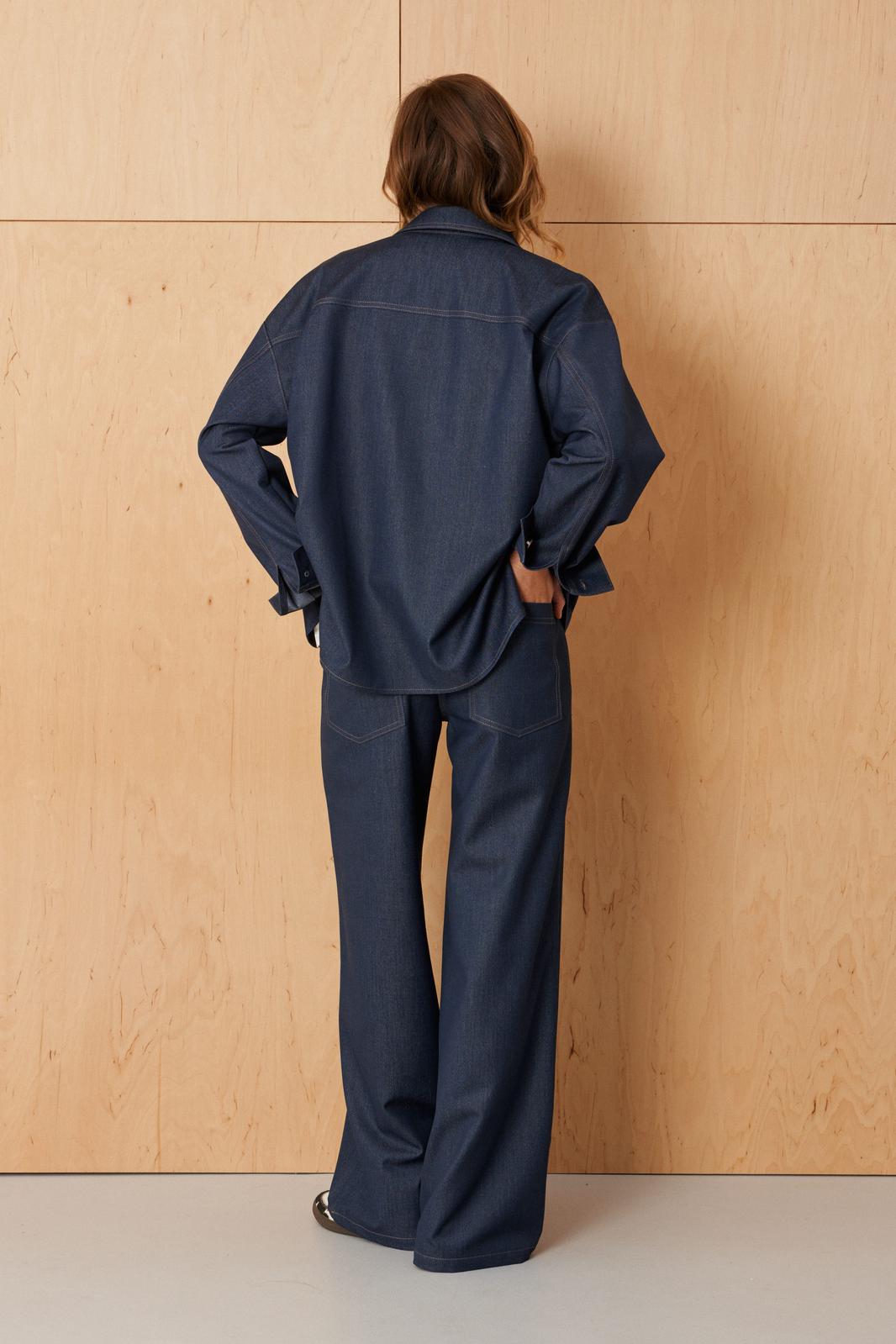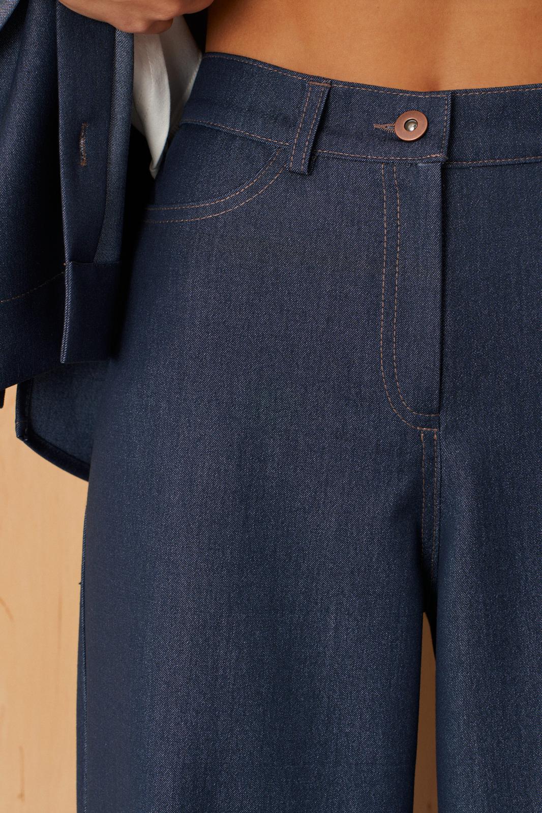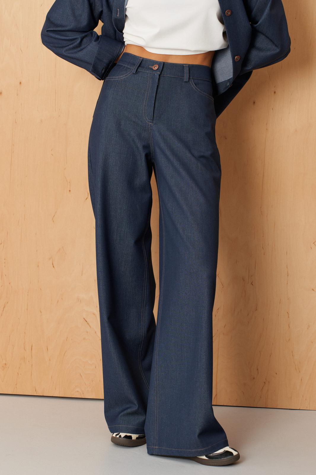 Эти стильные брюки изготовлены из качественной джинсовой поливискозной ткани, которая обеспечивает комфорт и долговечность. Модель обладает классическим прямым кроем и аккуратным верхним срезом, обработанным притачным поясом, что гарантирует удобную и устойчивую посадку. Застежка выполнена на обметанную петлю и пуговицу, дополненных застежкой-молнией, в среднем шве. Передняя часть украшена двумя карманами с подкройным бочком, а сзади расположены два накладных кармана и две талиевые вытачки, подчеркивающие фигуру и придающие брюкам практичность. Выполненные в насыщенном синем оттенке с декоративными строчками, эти брюки отлично сочетаются с различными элементами гардероба, создавая современный и элегантный образ. Они идеально подходят для повседневных прогулок, встреч, работы или любого другого мероприятия, требующего стильного и удобного решения.