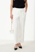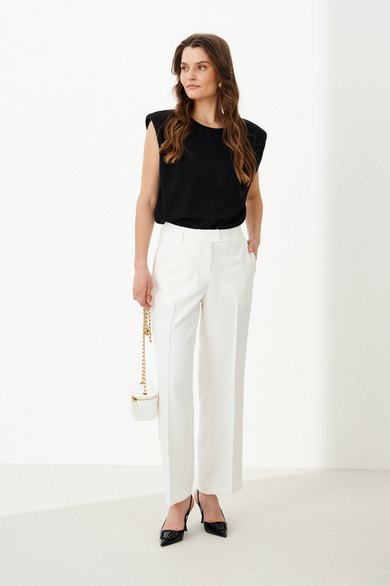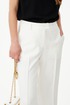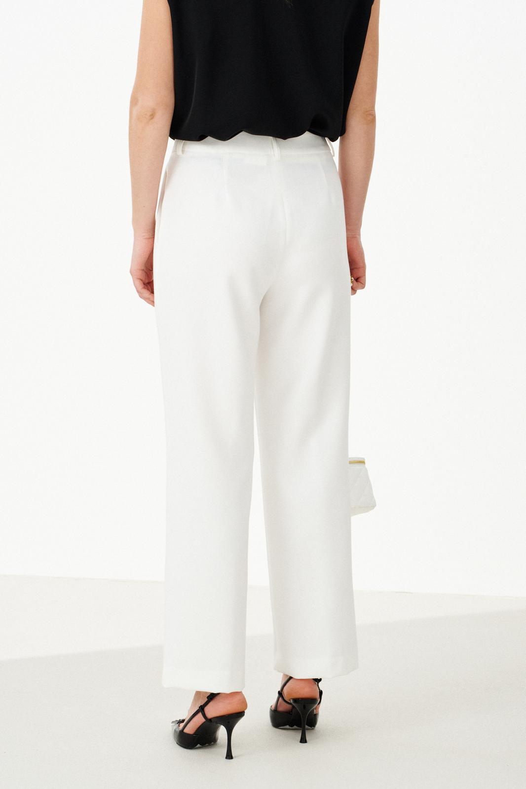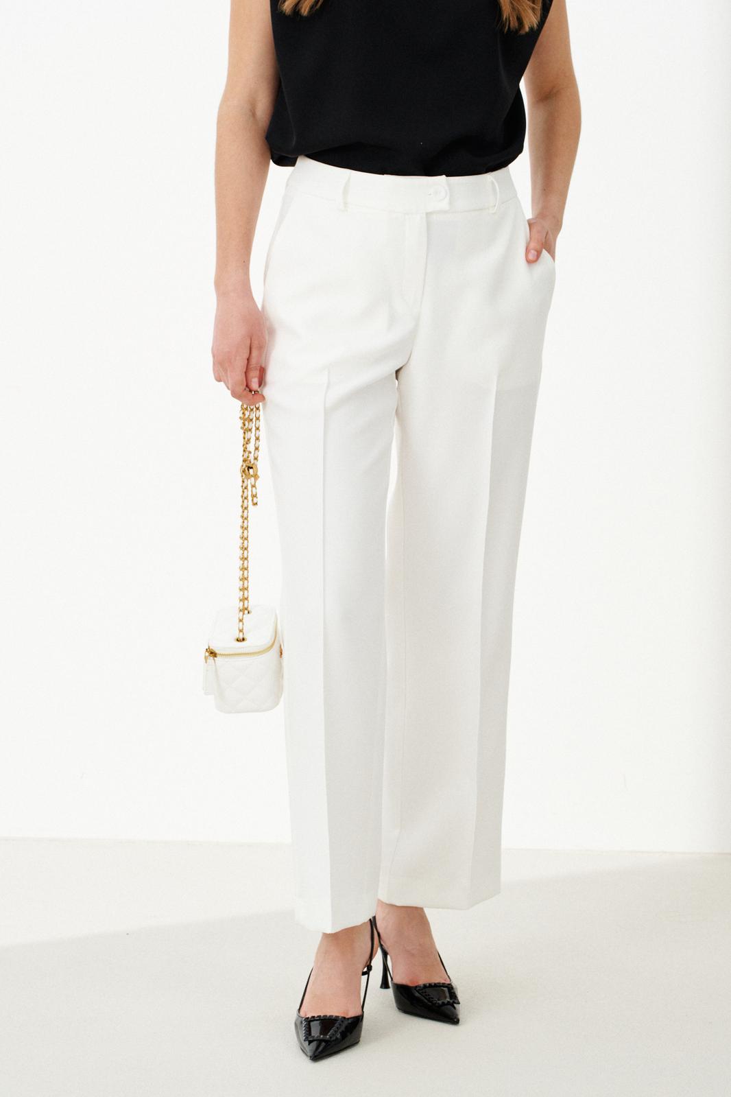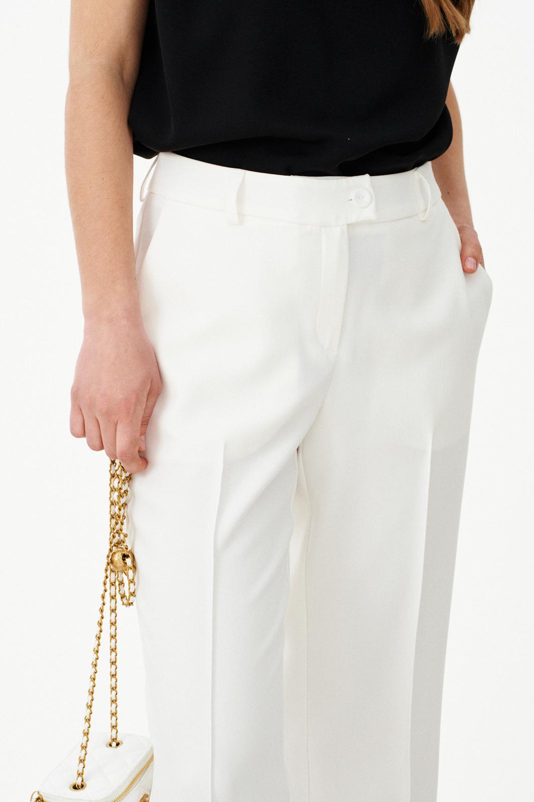 Эти женские брюки выполнены из костюмной поливискозной ткани молочного цвета, идеально подходящей для повседневных образов. Их классический крой и нейтральный оттенок делают их универсальным элементом гардероба.