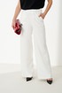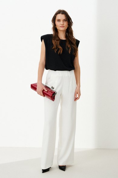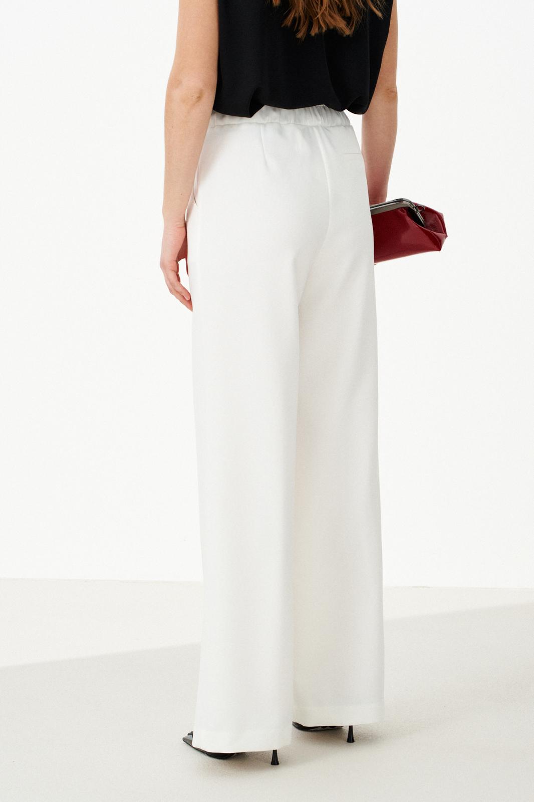 Женские брюки из поливискозной ткани идеально подходят для повседневной носки. Верхний срез обработан притачным поясом со вставкой на резинке, обеспечивающим комфортную посадку. Пояс дополнен шлевками, что позволяет носить их с ремнем для дополнительной регулировки. Передняя часть украшена двумя талиевыми вытачками, создающими аккуратный силуэт. Задняя часть также оснащена двумя талиевыми вытачками, а также имеется карман с листочкой и лейблом с логотипом бренда. Эти брюки белого оттенка сочетают стиль и практичность, делая их универсальным элементом гардероба.