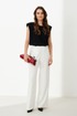 46 — Брюки: Высота посадки - 24см, Длина брюк с поясом - 111см, Длина по шаговому шву - 81.5см, Ширина брючин сверху - 69см, Обхват брюк по низу - 61см, Ширина по бедрам - 53см, Ширина по талии - 36см;