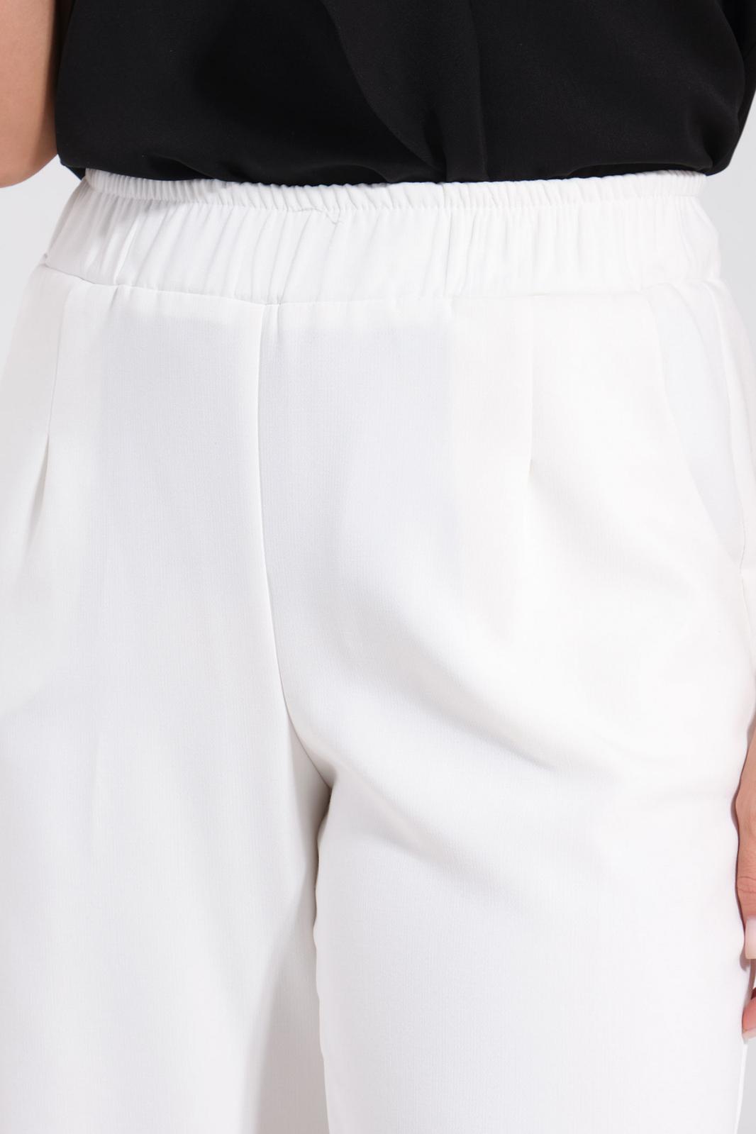 Женские брюки из поливискозной ткани идеально подходят для повседневной носки. Верхний срез обработан притачным поясом со вставкой на резинке, обеспечивающим комфортную посадку. Пояс дополнен шлевками, что позволяет носить их с ремнем для дополнительной регулировки. Передняя часть украшена двумя талиевыми вытачками, создающими аккуратный силуэт. Задняя часть также оснащена двумя талиевыми вытачками, а также имеется карман с листочкой и лейблом с логотипом бренда. Эти брюки белого оттенка сочетают стиль и практичность, делая их универсальным элементом гардероба.