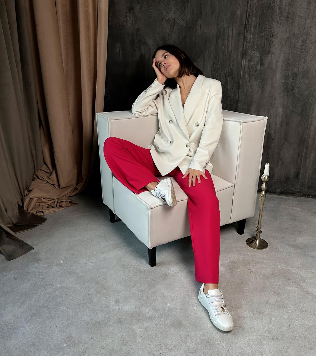 44 — Брюки: Высота посадки - 31см, Длина брюк без пояса - 109.5см, Длина по внутреннему шву - 84см, Ширина брючин сверху - 67см, Обхват брюк по низу - 55см, Ширина по бедрам - 49см, Ширина по талии - 34.5см;