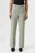 Брюки женские из поливискозной ткани для повседневной носки. Брюки прямые, слегка зауженные. На передней части брюк есть боковые карманы. Верх брюк обработан отрезным поясом, застёгивающийся на тесьму-молнию и потайной крючок. На задней части брюк есть талиевые вытачки и прорезные карманы. Ткань однотонная.