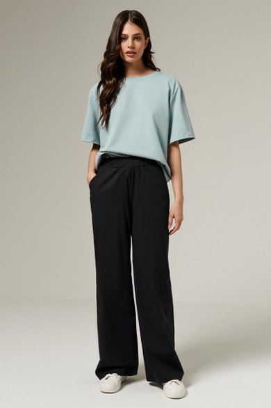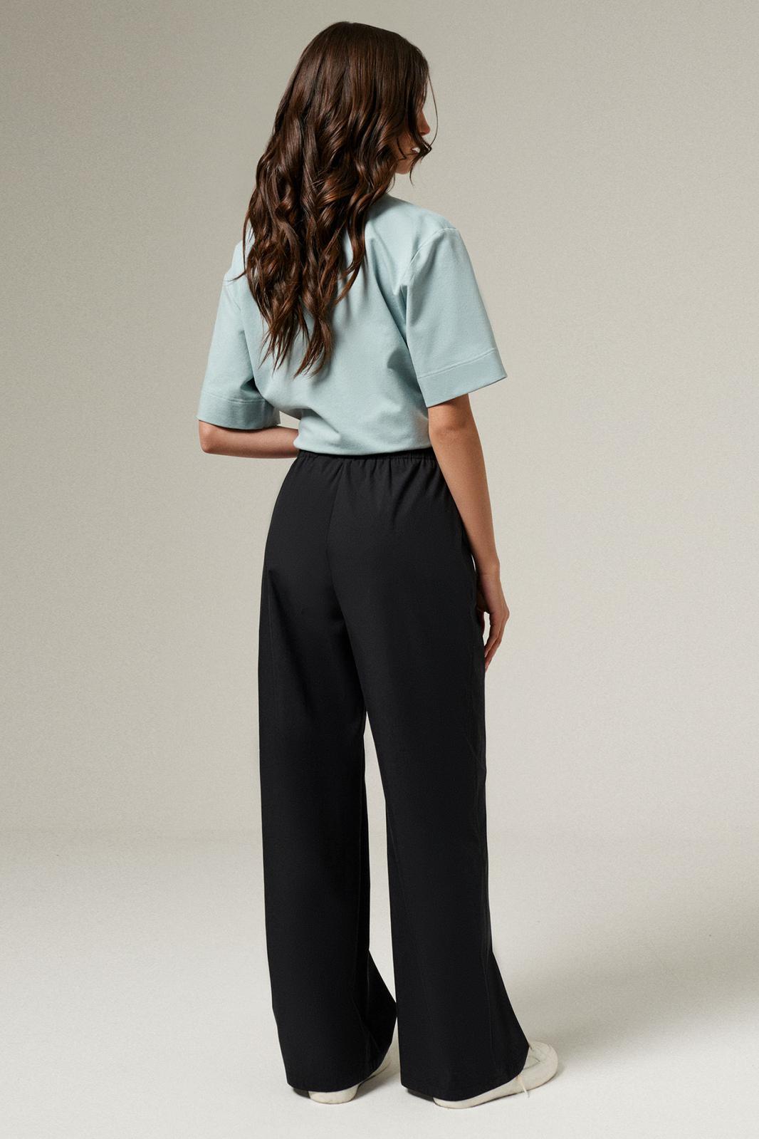 Брюки женские из хлопковой ткани для повседневной носки. Брюки прямого силуэта на поясе. Пояс на резинке, в боковых швах прорезные карманы. Длина брюк классическая.