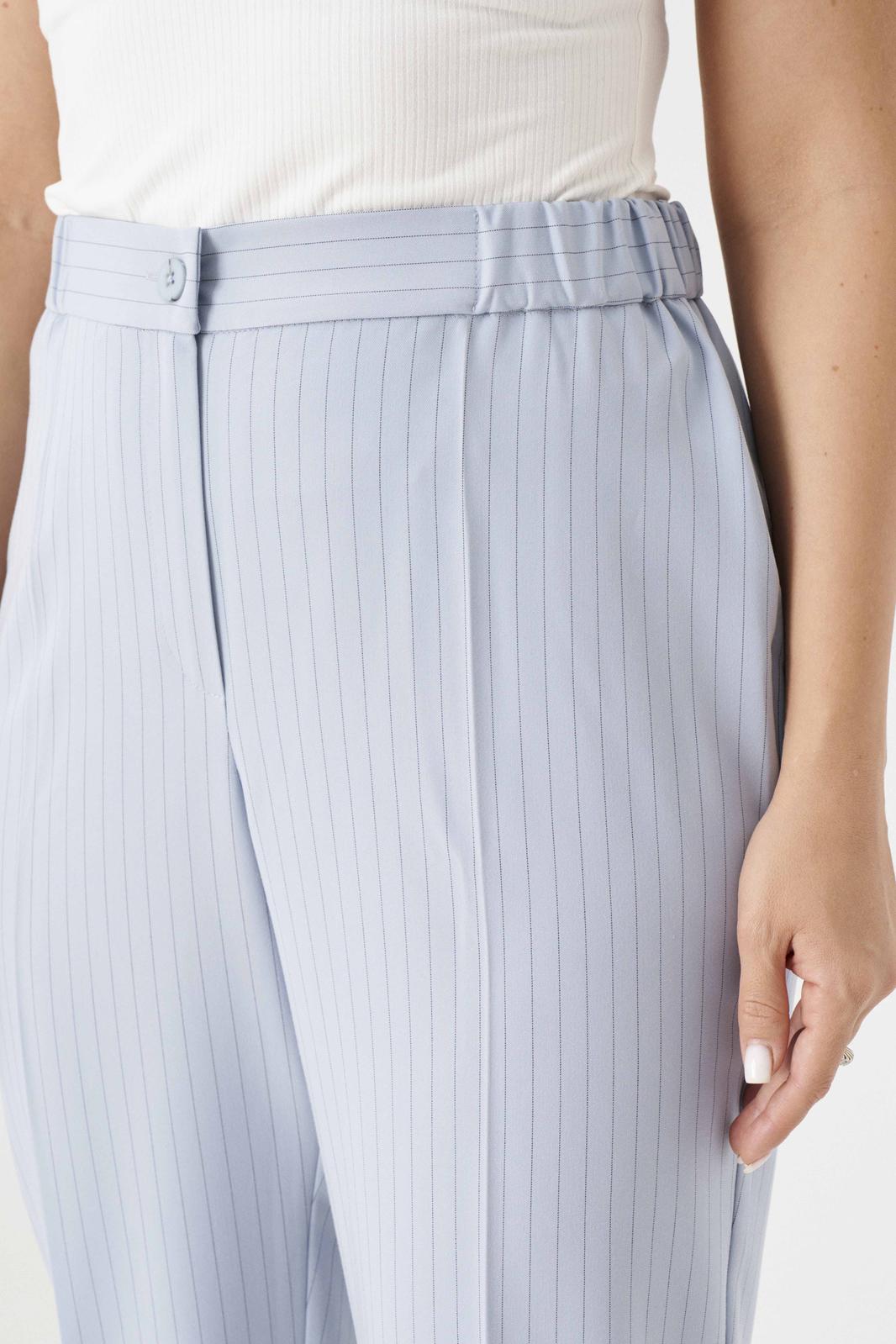 Брюки женские из смесовой ткани для повседневной носки, слегка зауженные к низу. Верхний срез брюк обработан притачным поясом, по боковым частям брюк имеется вставка на резинке. Застежка в поясе на одну обметанную петлю и одну пуговицу, а также застежка-молния в среднем шве брюк. Отличный вариант брюк, которые будут гармонично смотреться под любые образы.