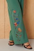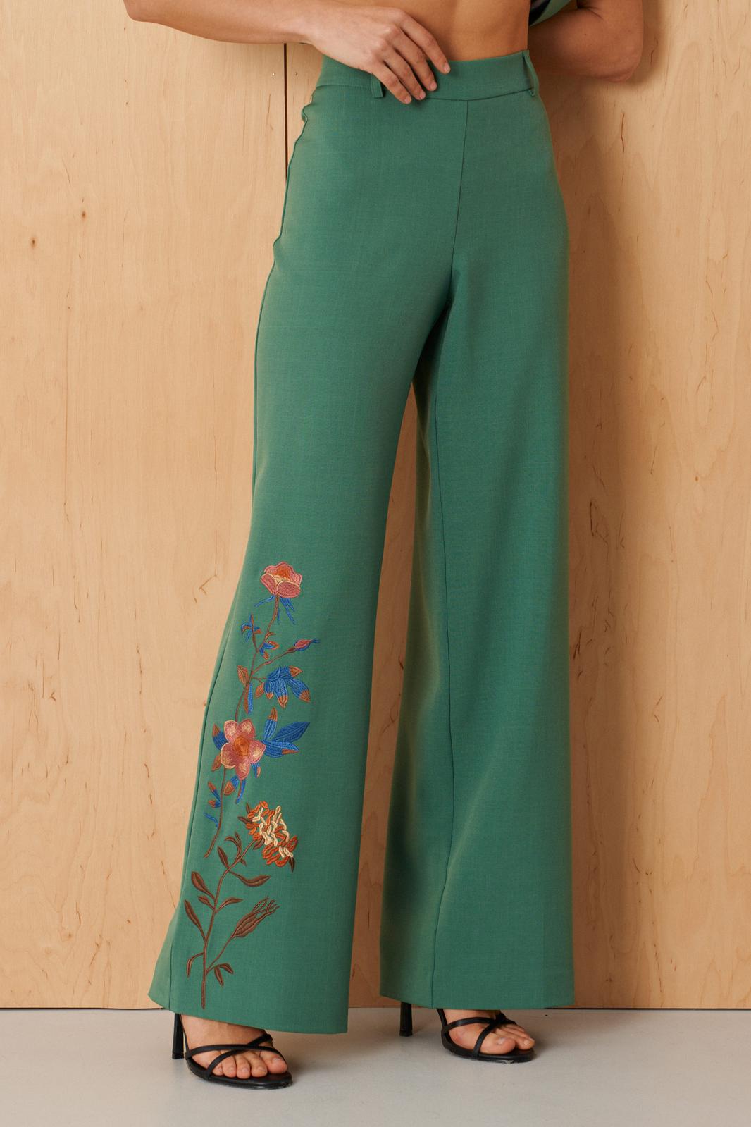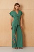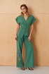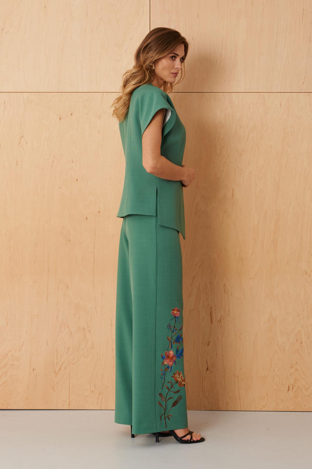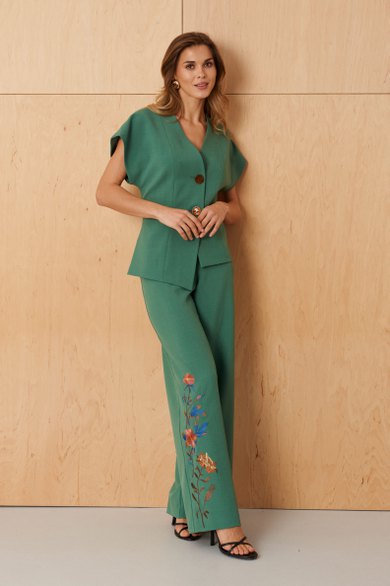 Этот женский костюм выполнен из поливискозной ткани, идеально подходящей для повседневной носки за счет своей мягкости и приятной текстуры. Он состоит из жакета и брюк, предоставляя стильное и функциональное решение для различных повседневных случаев. Жакет украшен центральной бортовой застежкой на две обмётанные петли и две пуговицы, что обеспечивает удобство и аккуратное облегание. Передняя часть жакета оформлена двумя вертикальными рельефами, идущими от плечевого шва до линии низа, что создает эффект визуальной вытянутости и стройности. Особенностью является то, что половинки переда и спинки жакета выполнены с разной длиной, что добавляет модели оригинальности. Спинка имеет средний шов и два вертикальных рельефа, идущих от плечевого шва до линии низа, а разрез в боковом шве добавит нотки оригинальности. Горловина V–образная, придающая выразительность образу. Цельнокроеные короткие рукава делают изделие более легким и комфортным, а жакет дополнен поливискозной подкладкой, которая обеспечивает дополнительное удобство и аккуратность кроя. Брюки выполнены в прямом крое, с притачным поясом с внутренней декоративной тесьмой из подкладочной ткани, что добавляет изделию тонкий декоративный акцент. Застежка расположена в боковой части пояса и выполнена на обметанную петлю и потайную застежку-молнию, обеспечивая хорошую посадку. Передняя часть брюк украшена дизайнерской вышивкой в виде веточек цветов, которая придает образу нежность и оригинальность. Задние талиевые вытачки обеспечивают хорошую посадку по фигуре, делая силуэт более аккуратным. Стильный, гармоничный и практичный костюм зеленого оттенка, легко сочетаемый с различной обувью и аксессуарами для создания повседневных и деловых образов.