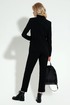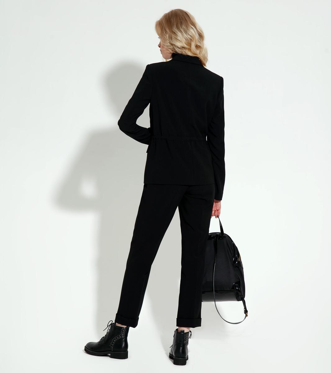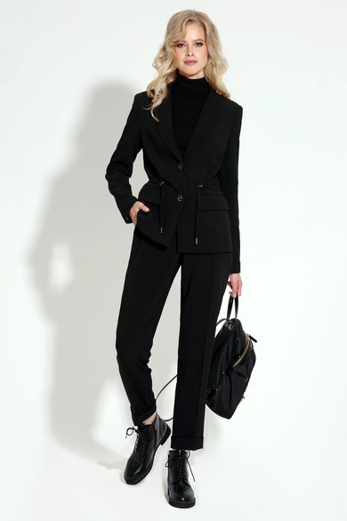 Современный костюм офисный женский составляют приталенный жакет с V-вырезом и отложным воротником, а также брюки с поясом на резинке и стрелками. Однобортный пиджак с кулисой подчеркивает талию, застегивается на пуговицы, имеет прорезные карманы с клапанами.