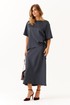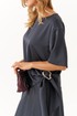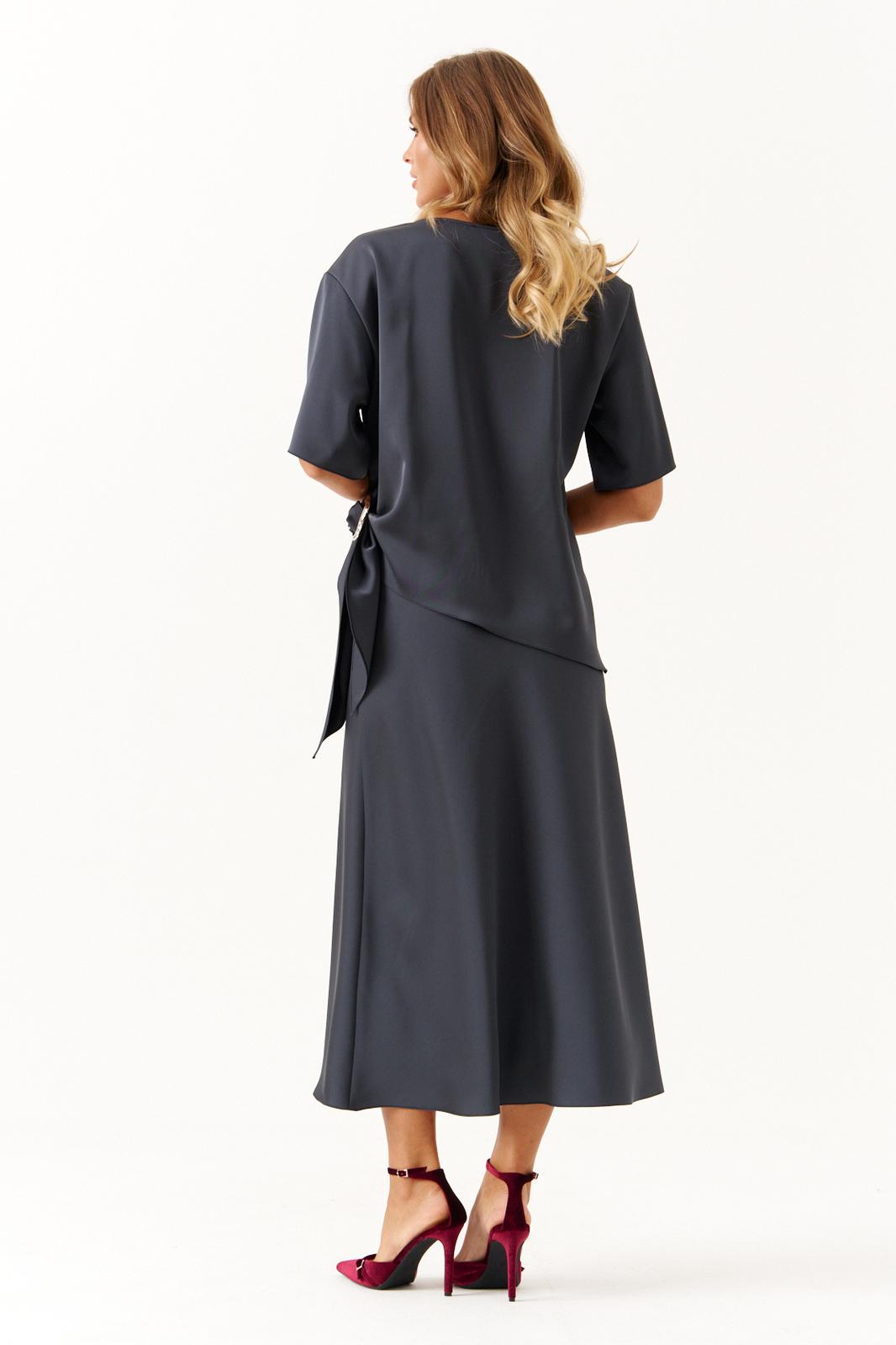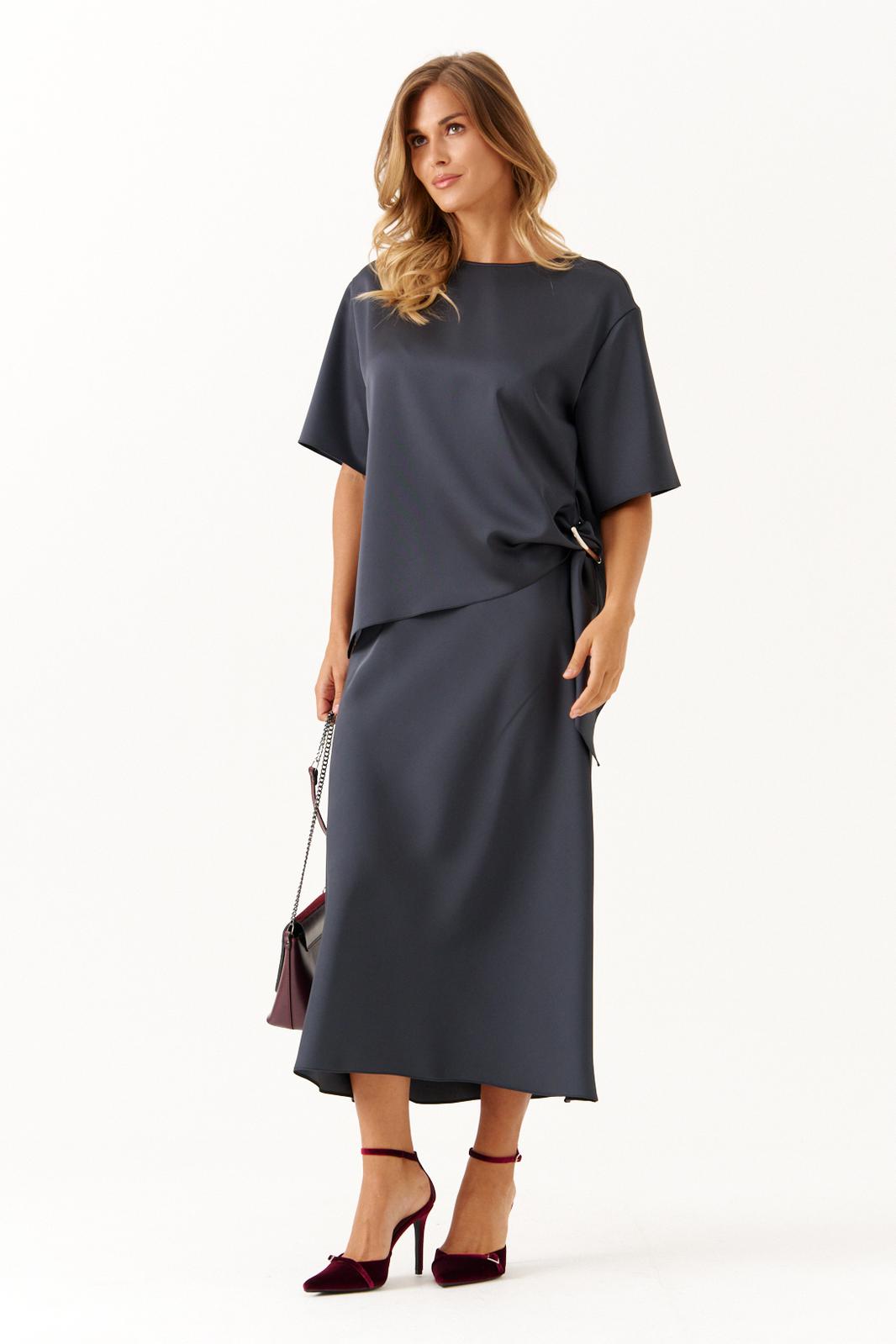 Стильный и комфортный костюм для повседневной носки состоит из блузки и юбки. Блузка имеет прямой силуэт с расширенной горловиной, втачными рукавами длиной чуть ниже локтя и аккуратными боковыми разрезами, украшенными декоративным узлом с серебряной пряжкой, что придает образу изысканность. Юбка выкроена по косой, обеспечивая элегантный и плавный силуэт. Верхний срез юбки обработан внутренней резинкой для комфортной посадки, длина модели — до щиколотки, добавляющая женственности и легкости. Этот графитовый костюм сочетает в себе изящество атласа и удобство, прекрасно подходя как для повседневных образов, так и для более официальных мероприятий.
