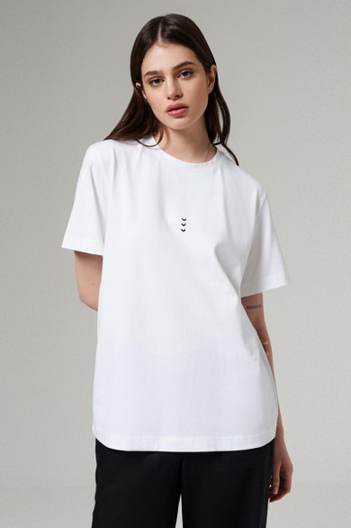 Футболка женская полуприлегающего силуэта из натурального полотна для повседневной носки. Рукав короткий втачной, горловина круглая. По переду декор в виде печати. Длина классическая.