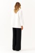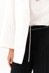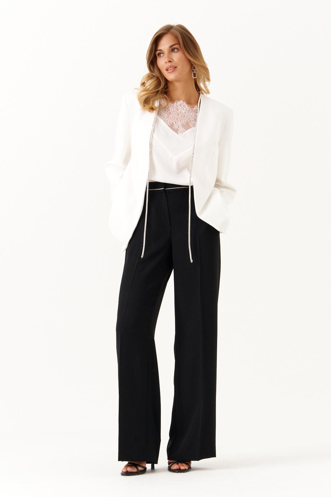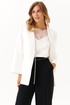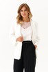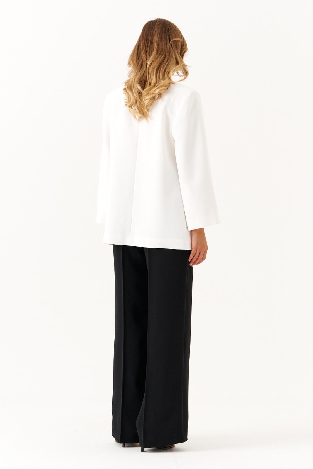Жакет женский из легкой струящейся ткани, предназначенный для торжественных мероприятий. Модель выполнена в молочном цвете и отличается элегантным кроем с двумя нагрудными вытачками на переде и средним швом на спинке, что обеспечивает идеальную посадку по фигуре. Край борта украшен декоративным шнуром со стразами, который плавно проходит вдоль V-образной горловины и борта, придавая изделию утонченность и изысканный блеск. Широкие втачные рукава добавляют свободу движения и стильный акцент. Этот жакет станет прекрасным дополнением к вечернему или праздничному образу.