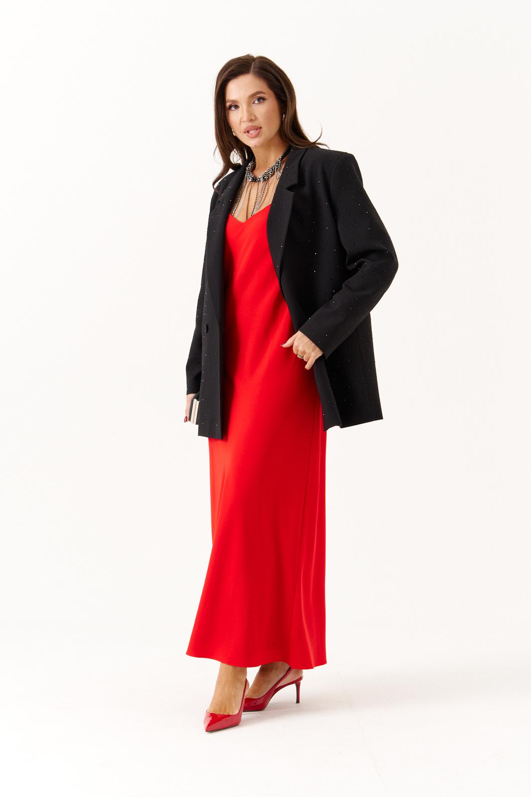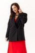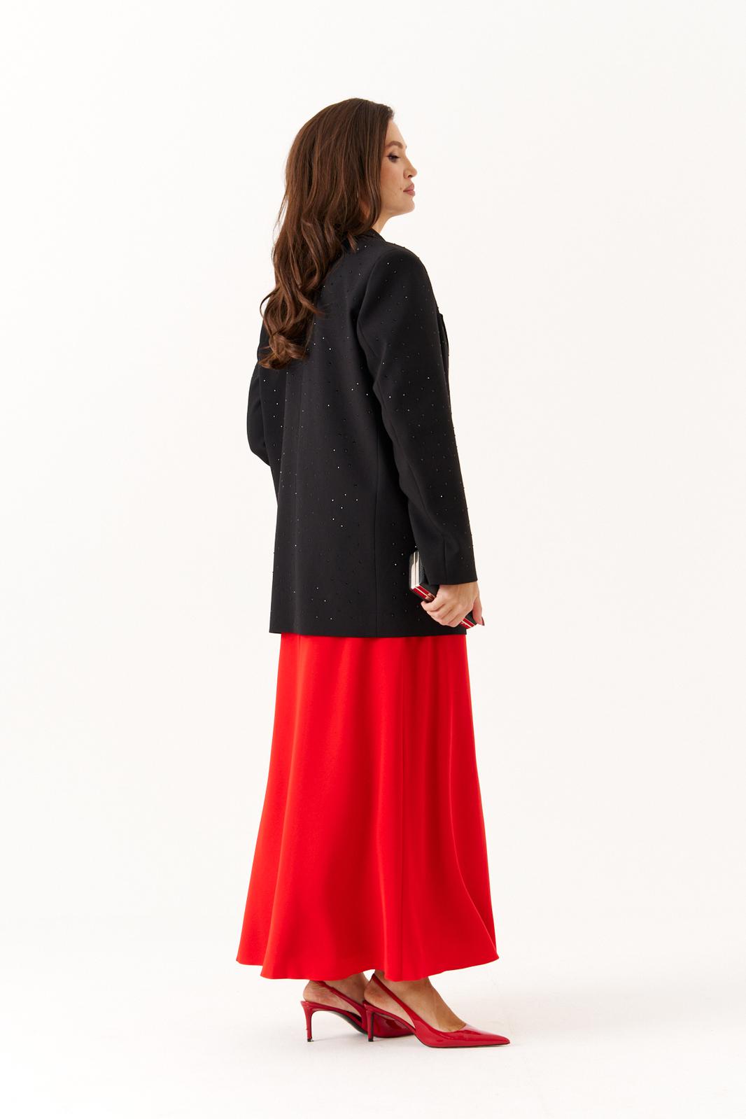 Этот женский жакет выполнен из элегантной поливискозной костюмной ткани черного цвета, идеально подходящей для торжественных и праздничных мероприятий. Модель отличается приталенным силуэтом, который подчеркнет фигуру и придаст образу изысканности. Застежка двубортная с обметанными петлями и пуговицами добавляет классический штрих и удобство в носке. Передняя часть украшена прорезными карманами в рамку с двумя обтачками, что не только придает модели утонченность, но и обеспечивает практическое использование. Спинка модели подчеркнута средним швом, создающим аккуратную линию силуэта. Горловина оформлена пиджачным воротником, придающим образу строгость и элегантность. Рукава втачные длинные, универсальны и позволяют комфортно носить жакет в любых условиях. Весь жакет украшен сияющими стразами, которые придают ему праздничный и женственный облик, превращая его в отличный выбор для особых случаев. Этот жакет сочетает в себе стиль, комфорт и нарядный внешний вид, делая его незаменимым элементом праздничного гардероба.