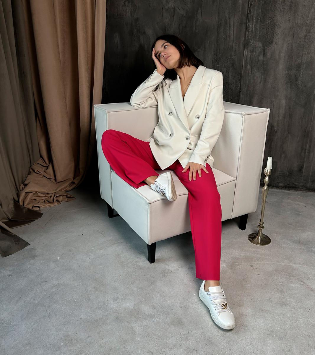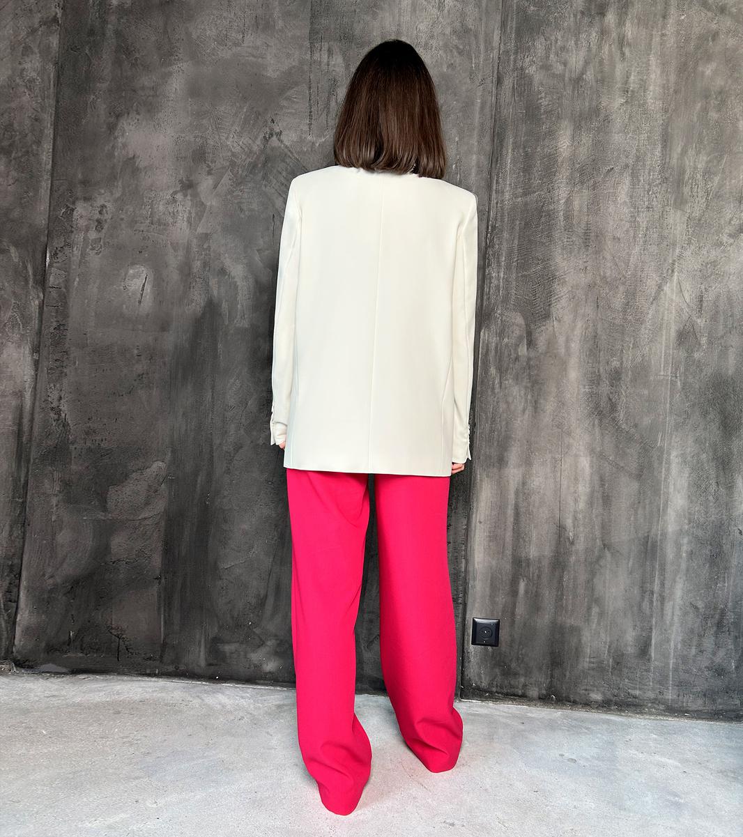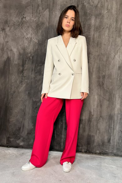 Удлиненный жакет прекрасно дополнит брюки в деловом стиле, уже имеющиеся в вашем арсенале модной одежды. Жакет женский оверсайз имеет достаточно свободный крой, не подразумевает посадку по фигуре. Вы можете носить деловой жакет как самодостаточный элемент, поддевая под низ нижнее белье, топ, однотонную футболку, майку. Двубортный жакет женский – отличный вариант. Поэтому он хорошо смотрится с узкими и широкими штанами. Выполнен жакет из трикотажа, хорошо держит форму. Вы можете купить черный классический пиджак по выгодной цене в размерах 42-50.